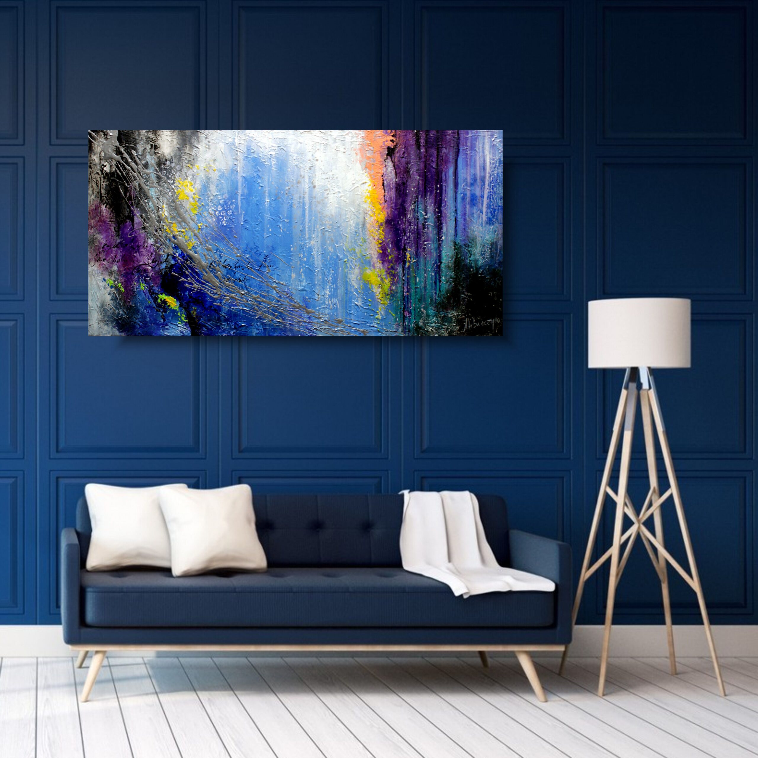 Abstrakcja duży niebieski obraz na płótnie “Płacząca wierzba” 1524A – zanurz się w nieprzewidywalnym tańcu kształtów i linii, odkryj piękno ukryte w abstrakcyjnej formie niedopowiedzianego przesłania. Abstrakcyjne formy, które tworzą tu wrażenie smutku i opuszczenia wydają się płynąć w dół, tworząc efekt płaczącej wierzby. Płacząca wierzba w ujęciu abstrakcyjnym to obraz, który wprowadza nas w sferę subtelnych emocji i refleksji.