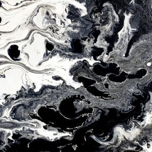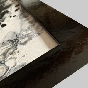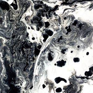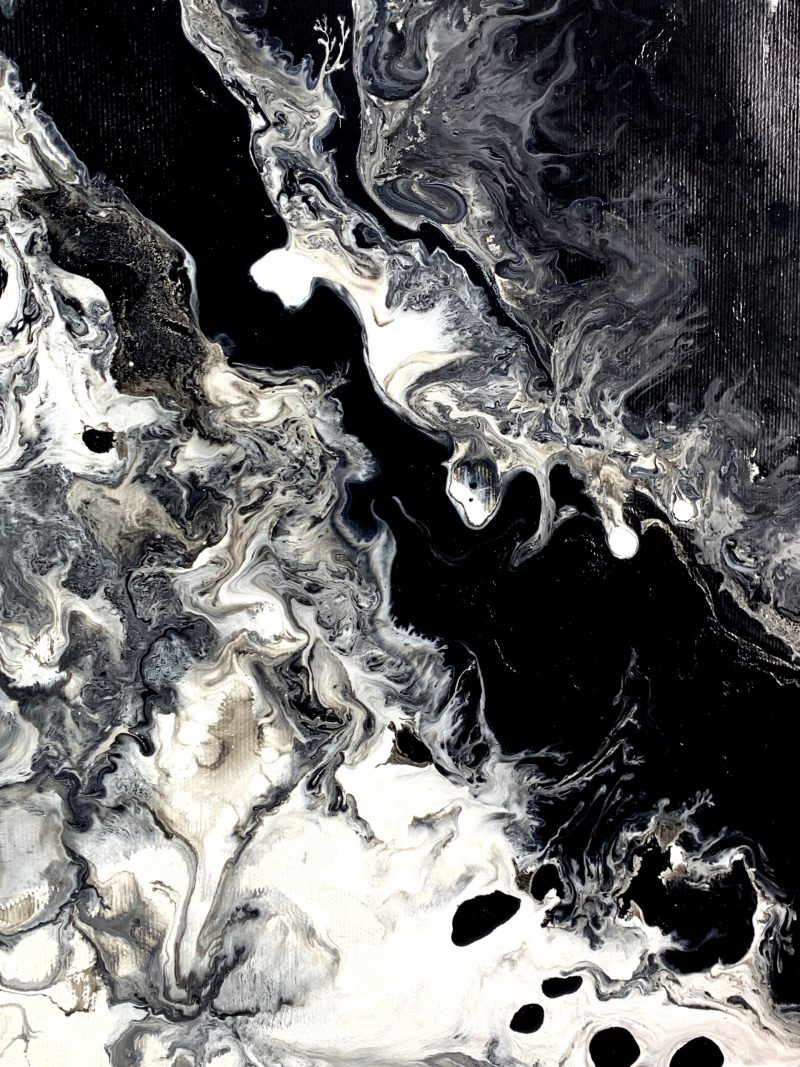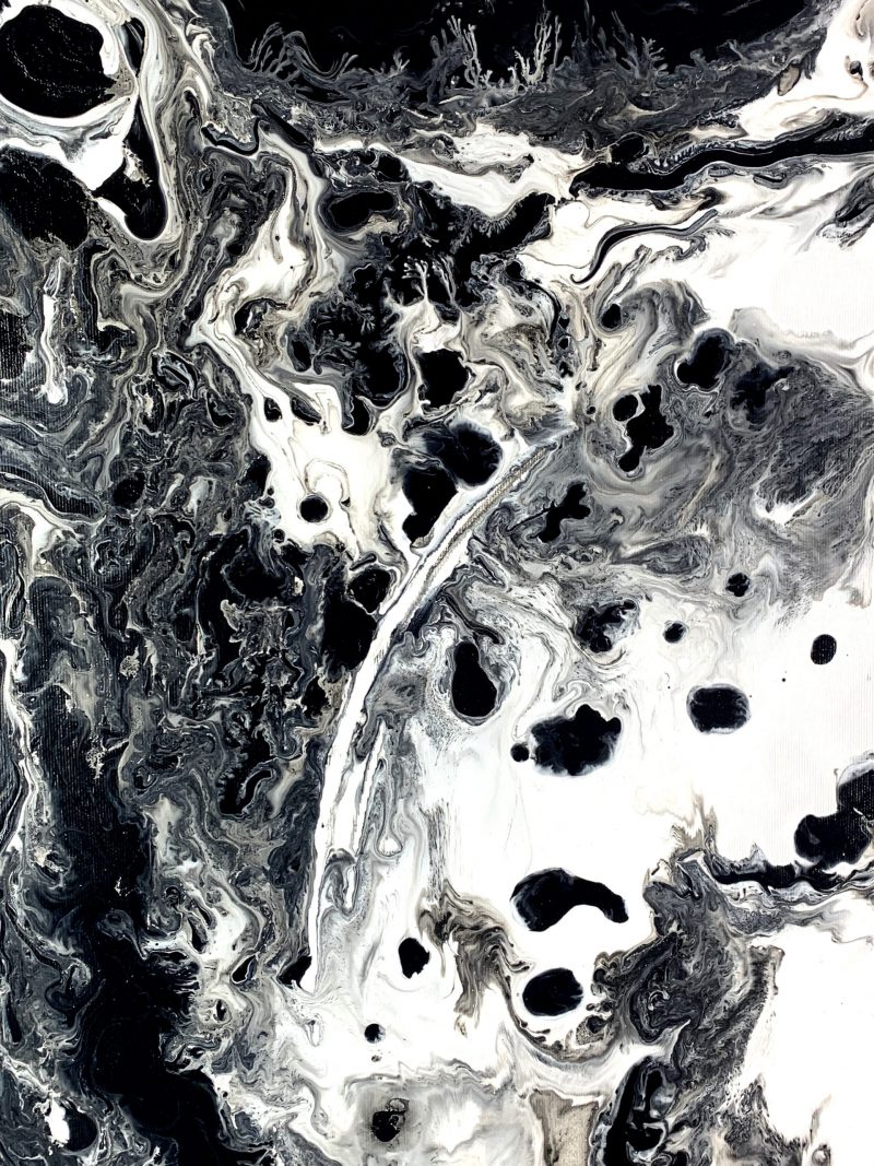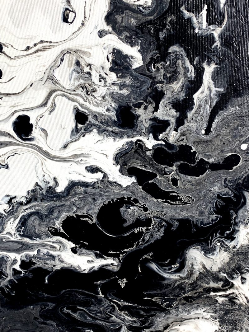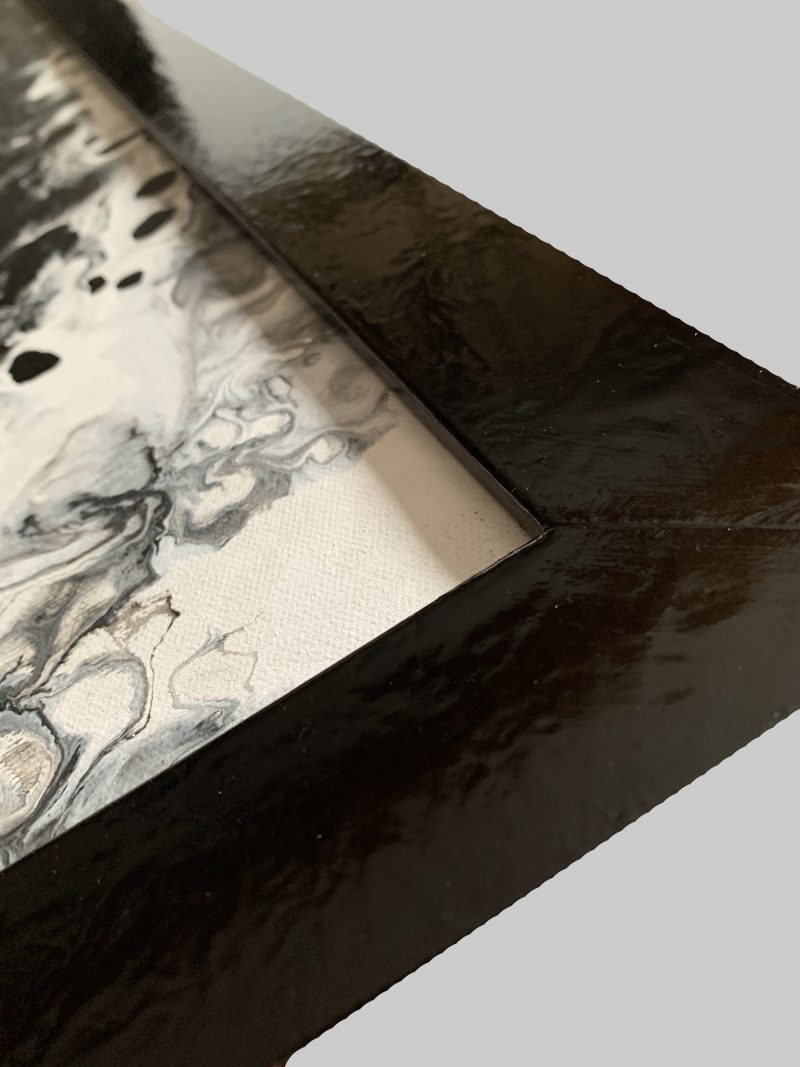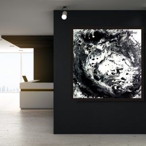 Czarno biały obraz abstrakcja naszego autorstwa w eleganckiej prostej czarnej ramie w połysku. Kolory użytej farby akrylowej nawiązują do widoku otchłani w czarno białych barwach. Obraz w tym kolorze idealnie ozdobi nowoczesny salon czy modny loft. Obraz wykonany w technice pouringu dlatego jest niepowtarzalny, jedyny w swoim rodzaju. Malujemy obraz dzielony na jednej części lub obraz jednoczęściowy podzielić na kilka części. Tworzymy także autorskie ramy do naszych obrazów, których nie kupisz w żadnym innym sklepie.