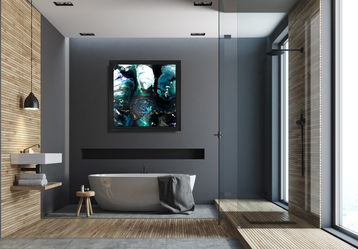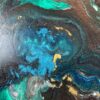 Duży obraz abstrakcja szmaragdowa „Z kosmosu” w czarnej drewnianej ramie 2027A składa się z 1 części + rama – stanowią komplet.