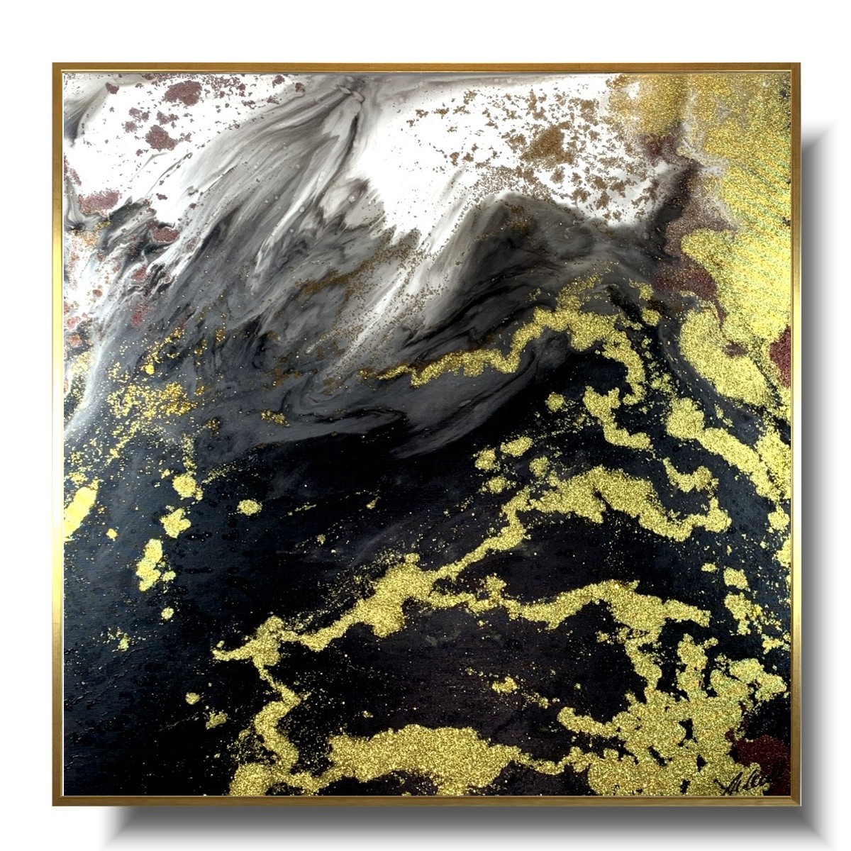 Duży obraz abstrakcja złota lawa naszego autorstwa w wąskiej eleganckiej złotej ramie. Kolory użytej farby akrylowej nawiązują do widoku wylewającej się złotej lawy. Obraz w tym kolorze idealnie ozdobi nowoczesny salon czy modny loft. Obraz wykonany w technice pouringu dlatego jest niepowtarzalny, jedyny w swoim rodzaju.  Malujemy obraz dzielony na jednej części lub obraz jednoczęściowy podzielić na kilka części. Tworzymy także autorskie ramy do naszych obrazów, których nie kupisz w żadnym innym sklepie.
