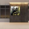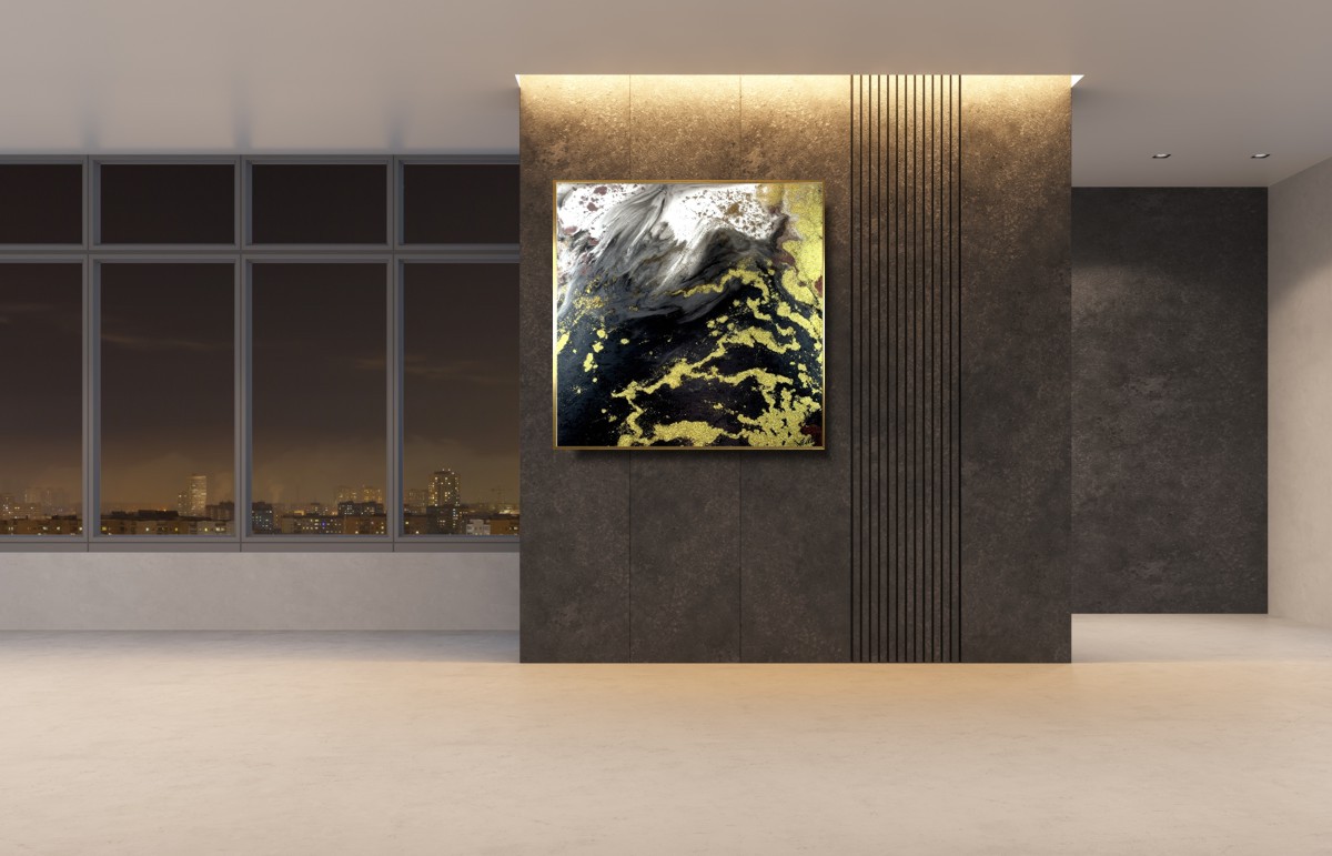 Duży obraz abstrakcja złota lawa w złotej ramie 2089A przywołuje na myśl Bárðarbunga – aktywny wulkan położony w Islandii. Rozlewająca się materia jak lawa wdziera się w każdą przestrzeń płótna.