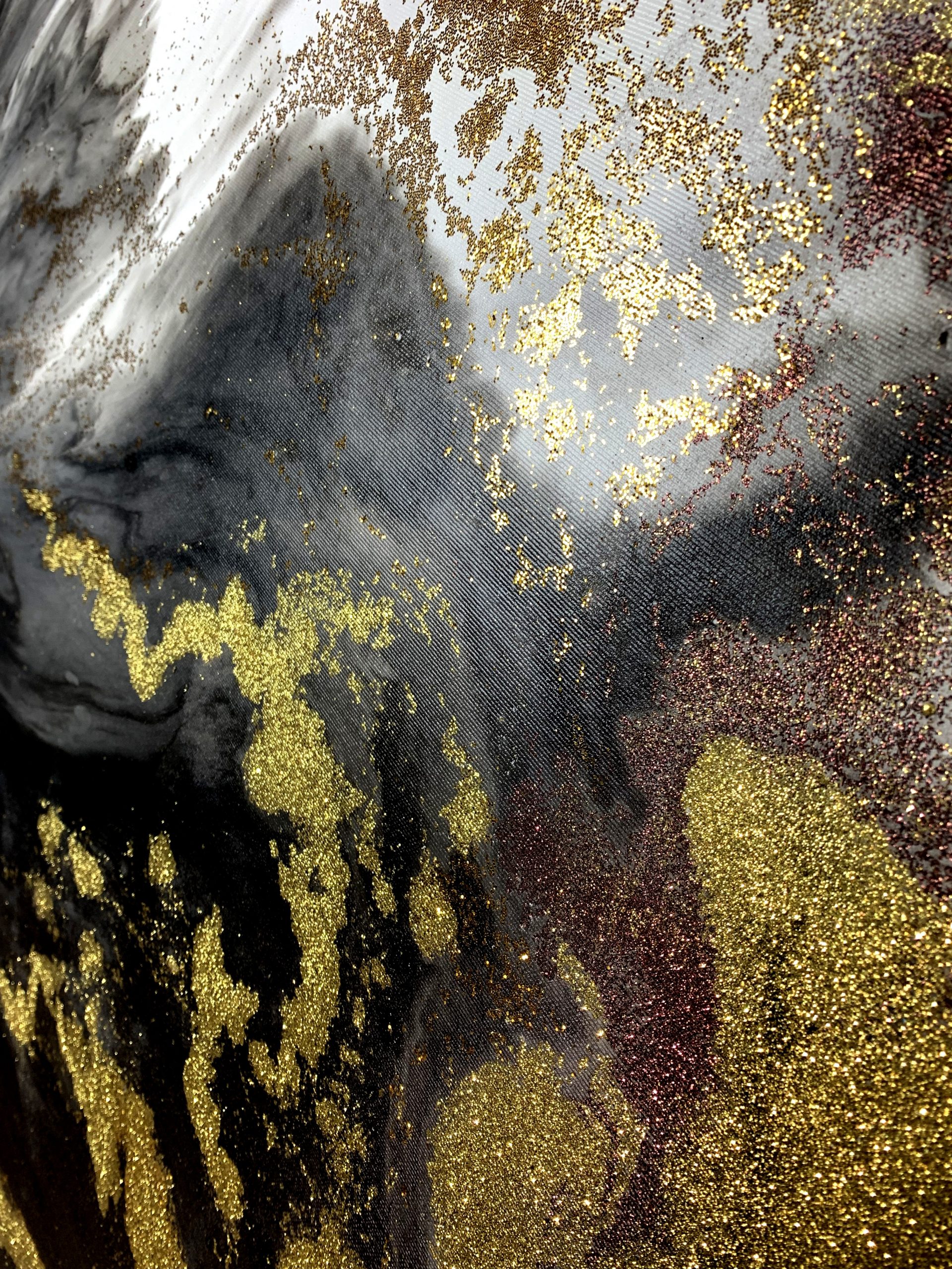 Kolorystyka obrazu: szary, czarny, biały, złoty i brązowy brokat + złota cienka rama (listwa szerokości 1,5cm) .