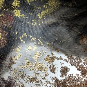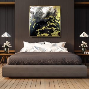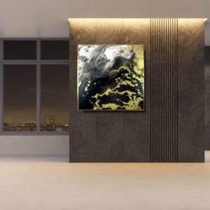 Duży obraz abstrakcja złota lawa w złotej ramie 2089A przywołuje na myśl Bárðarbunga – aktywny wulkan położony w Islandii. Rozlewająca się materia jak lawa wdziera się w każdą przestrzeń płótna.