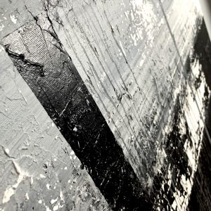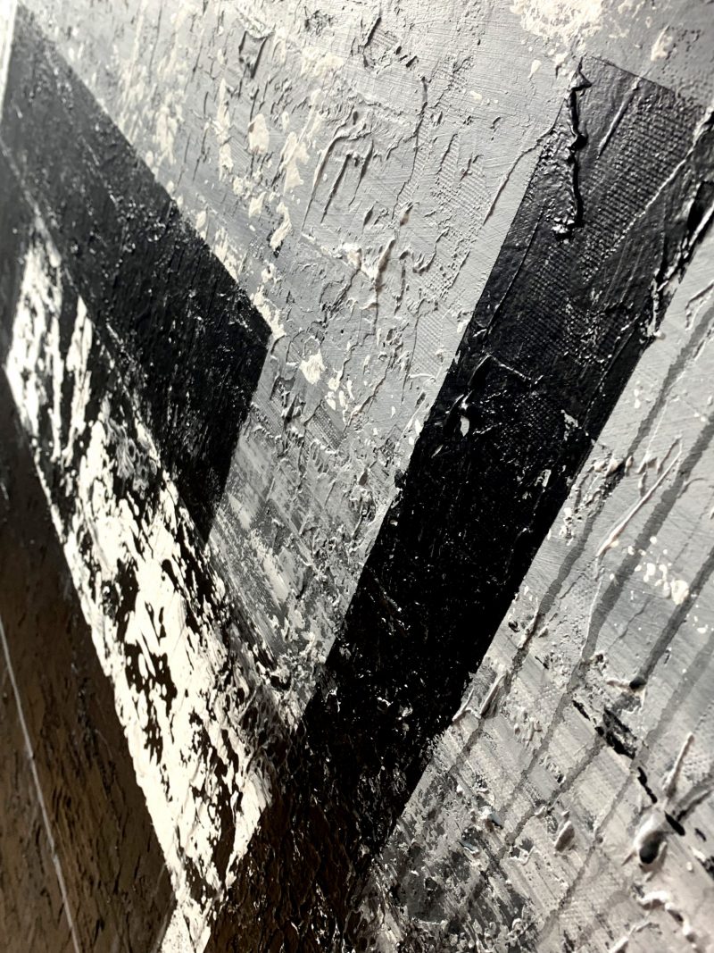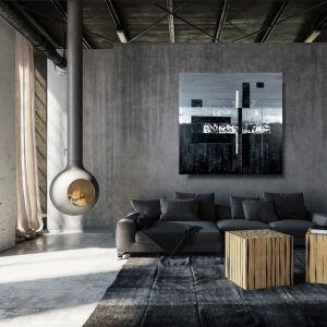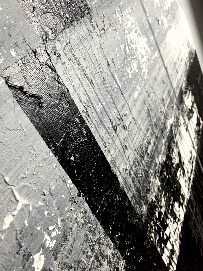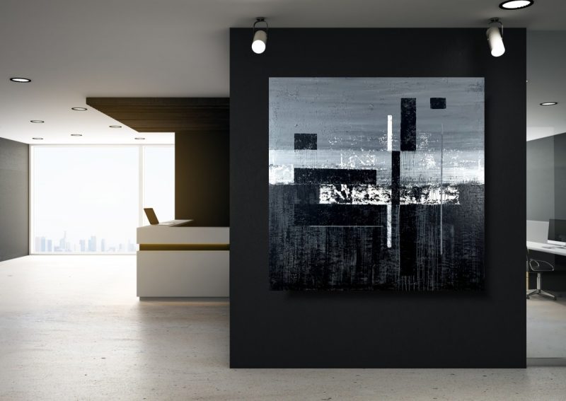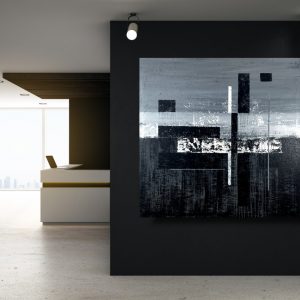 Duży obraz czarno biały autorska kolekcja 2096A to czysta synteza formy. Artysta wprowadzając w płaszczyznę obrazu pionowe i poziome podziały tworzy pewnego rodzaju rytmy. Chłodna szarość i czerń staje się tłem dla równoległych pasów, dających złudzenie niedokończonego labiryntu.