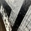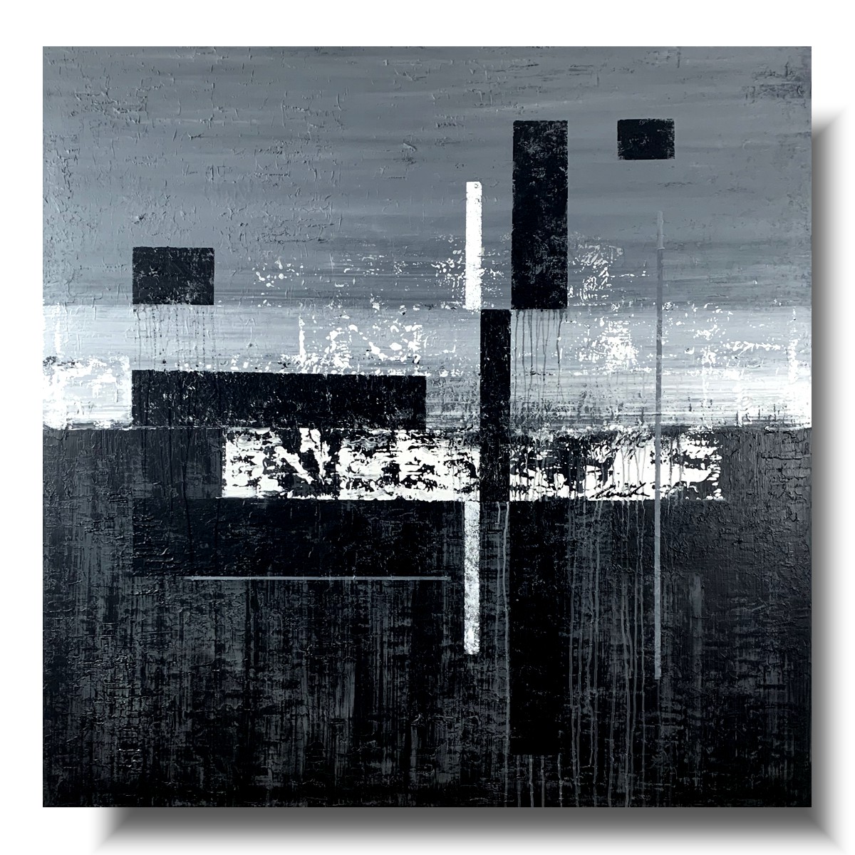 Duży obraz czarno biały autorska kolekcja 2096A to czysta synteza formy. Artysta wprowadzając w płaszczyznę obrazu pionowe i poziome podziały tworzy pewnego rodzaju rytmy. Chłodna szarość i czerń staje się tłem dla równoległych pasów, dających złudzenie niedokończonego labiryntu.