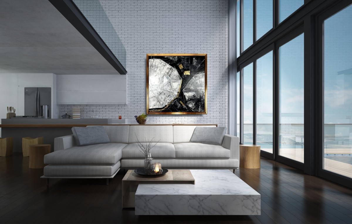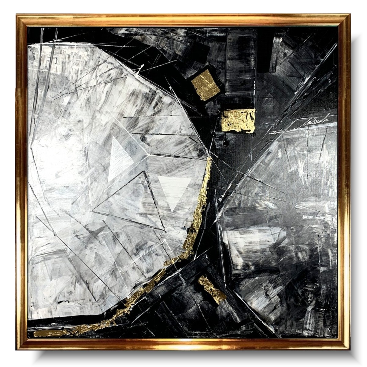 Duży obraz w złotej ramie „Trójkąty i kwadraty” abstrakcja 2104A to ogromny kwadratowy obraz naszego autorstwa w modnej, eleganckiej kolorystyce i złotej ramie. Kolory użytej farby akrylowej dodają elegancji, a wszystko wzbogacają płatki złota. Piękna złota gruba rama sprawi, że obraz będzie prezentował się perfekcyjnie w każdym wnętrzu – nowoczesnym i klasycznym. Obraz idealnie ozdobi duży nowoczesny salon czy modne biuro. Połączenie szarości i złota jest duetem ponadczasowym dlatego gwarantujemy, że nie wyjdzie z mody. Wykonujemy obrazy marynistyczne, obrazy kwiaty, obrazy aniołów, obrazy dzielone – dyptyk, tryptyk, fortyk, obrazy jednoczęściowe w dużym formacie. Możemy namalować każdy obraz z naszej oferty w zmienionych wymiarach lub kolorystyce. Możemy namalować obraz dzielony na jednej części lub obraz jednoczęściowy podzielić na kolka części.