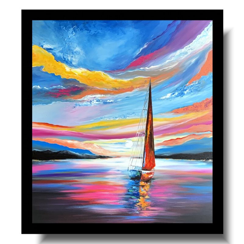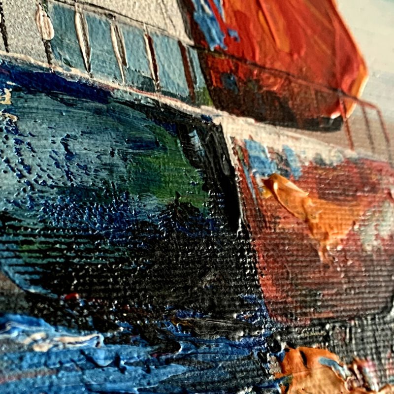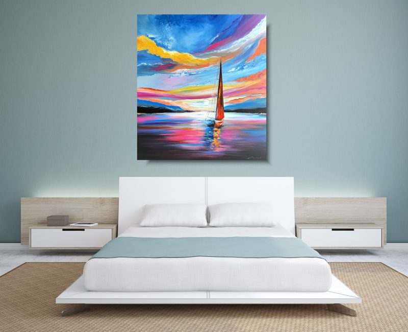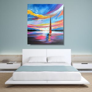 Duży obraz “Romantyczny rejs” obrazy marynistyczne przedstawiający morski pejzaż w mocnych energetycznych kolorach. Obraz ręcznie malowany jest niekonwencjonalny pod względem formalnym jaki i warsztatowym. Do namalowania tego obrazu użyto całej palety barw, co daje efekt nowoczesnego designu. Obraz może ożywić modne jednobarwne wnętrze – salon, biuro korytarz. Na specjalne życzenie Klientów wykonujemy także obrazy na zamówienie – obrazy z kwiatami, obrazy abstrakcyjne, obrazy z aniołami, obrazy z postaciami. O szczegóły proszę pytać mailowo sklep@nowa.dobrasztuka.pl