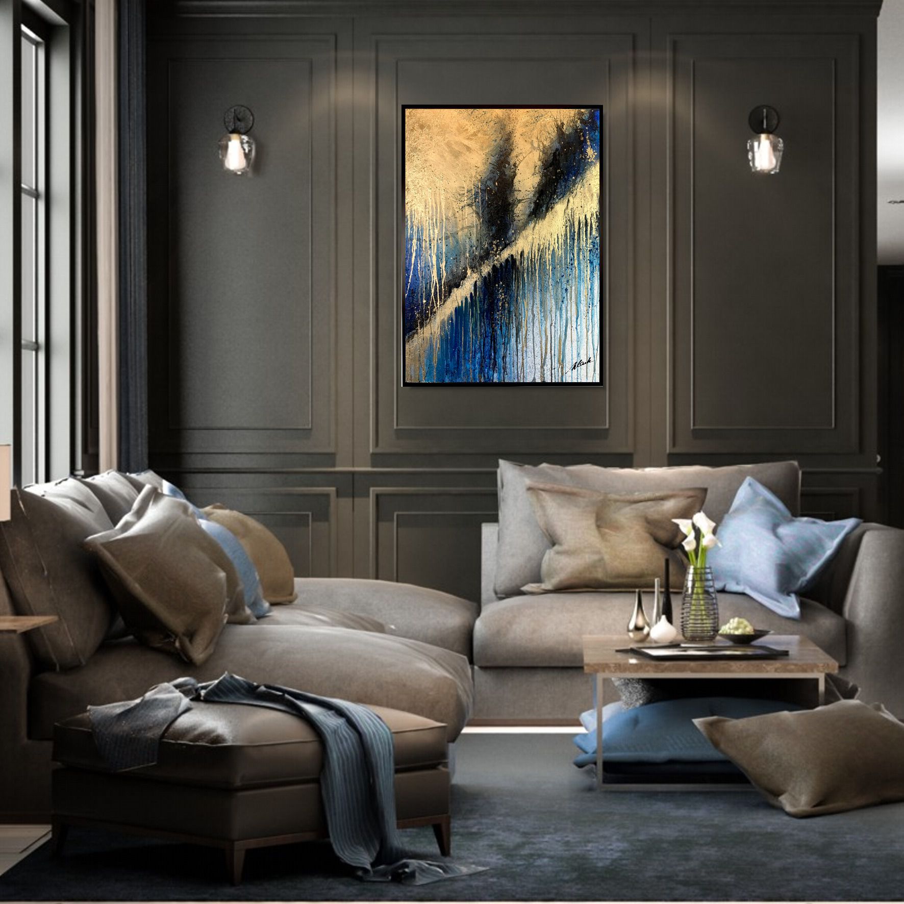 Kolorystyka obrazu: złoty, granatowy, niebieski, szary, biały, czarny, złoty brokat + czarna matowa rama (listwa szerokości 1,5cm)