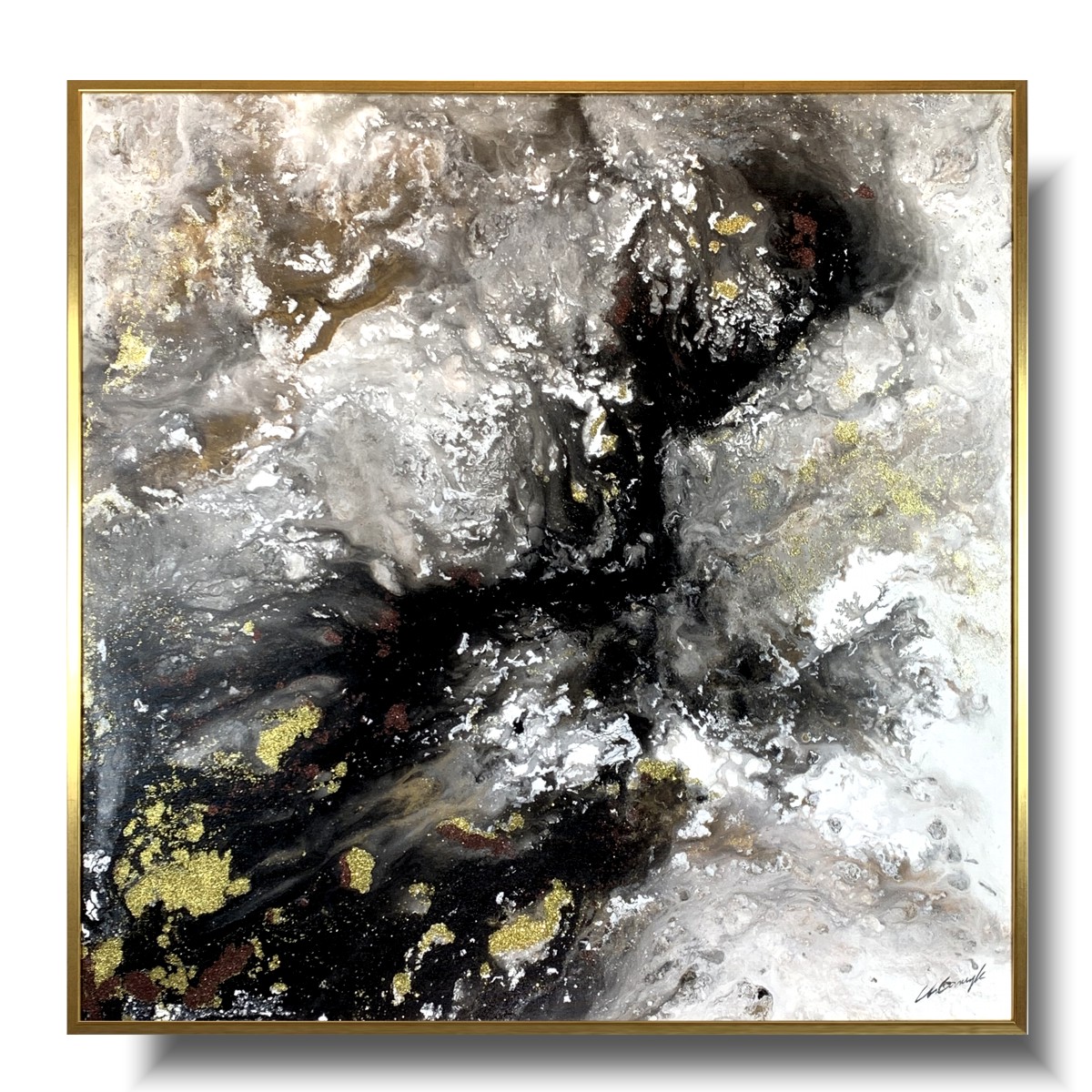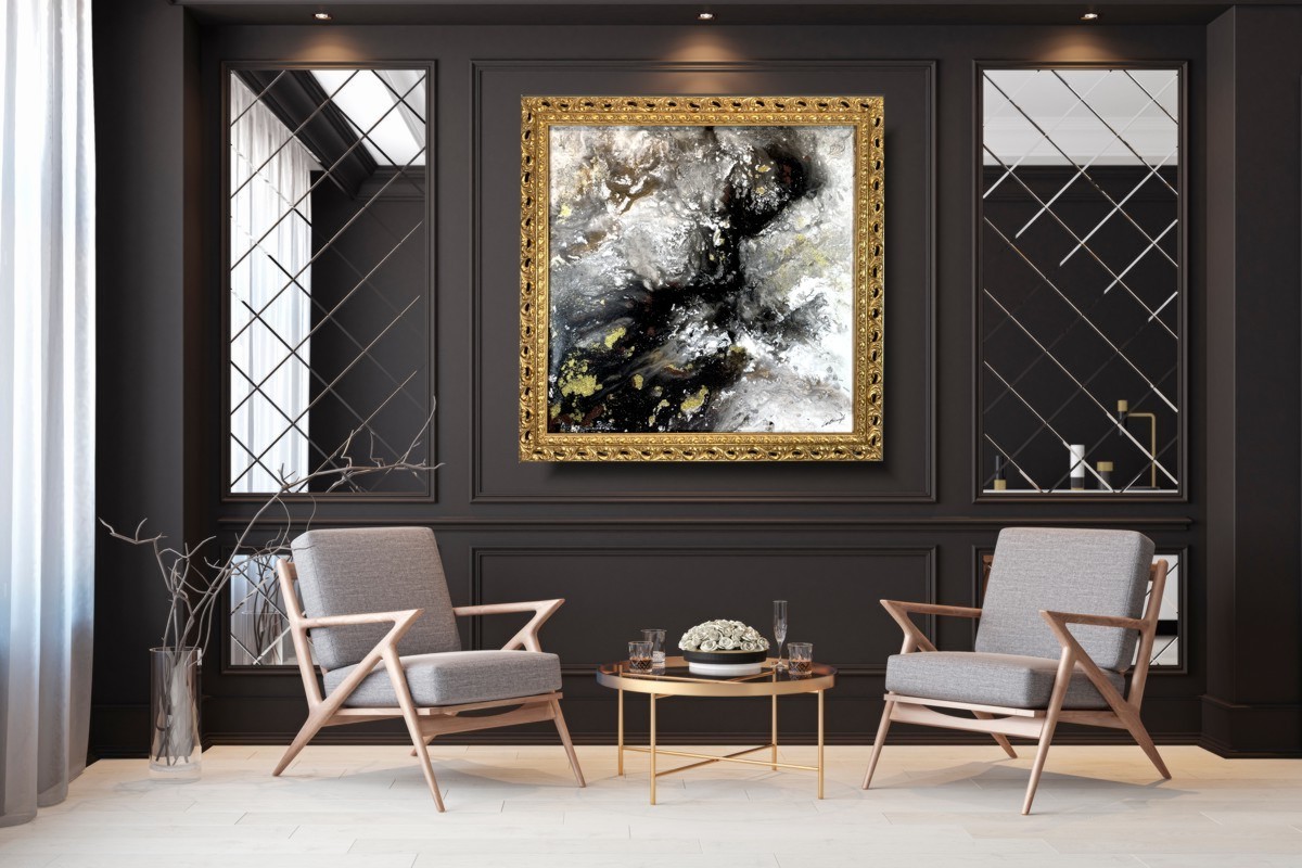 Kolekcja autorska abstrakcja złoty pył naszego autorstwa w eleganckiej, ponadczasowej kolorystyce i złotej rzeźbionej lub cienkiej nowoczesnej ramie. Kolory użytej farby akrylowej przenikają się, dodają tajemniczości i splendoru dlatego nikt nie przejdzie obok niego obojętnie. Niepowtarzalny obraz tworzony metodą pouringu z dodatkiem brokatu. Nowoczesne abstrakcje to nasza specjalność dlatego poświęcamy się im bez reszty. Wykonujemy także obrazy marynistyczne, obrazy kwiaty, obrazy aniołów, obrazy dzielone – dyptyk, tryptyk, fortyk, obrazy jednoczęściowe w dużym formacie. Możemy namalować każdy obraz z naszej oferty w zmienionych wymiarach lub kolorystyce, możemy namalować obraz dzielony na jednej części lub obraz jednoczęściowy podzielić na kilka części.