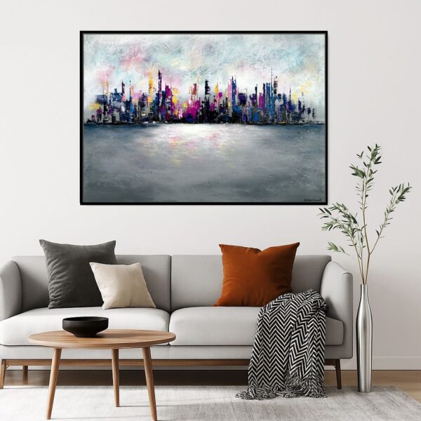 Kolorowy obraz abstrakcja w ramie „Bajeczne miasto” 2352A w pozytywnej kolorystyce i nowoczesnej czarnej ramie pudełkowej typu american box. Nowoczesny obraz ręcznie malowany stanowi idealną dekorację salonu, sypialni czy biura. Obraz malowany na płótnie ożywia naszą przestrzeń.