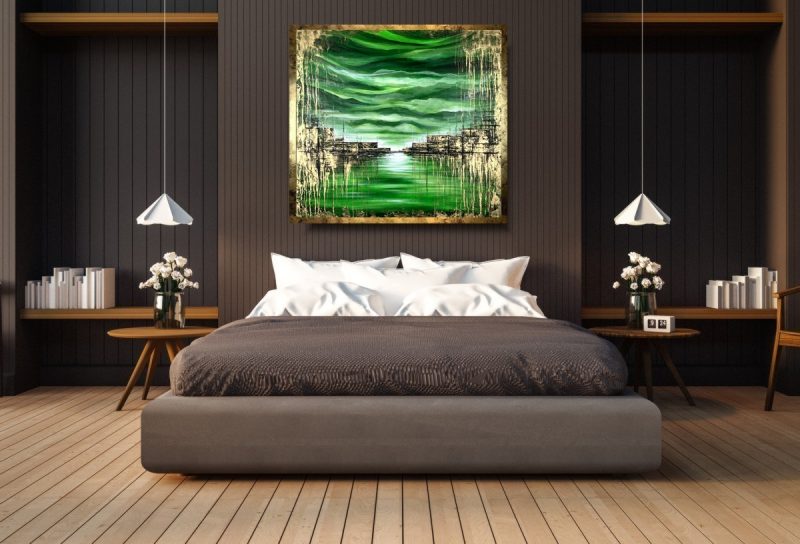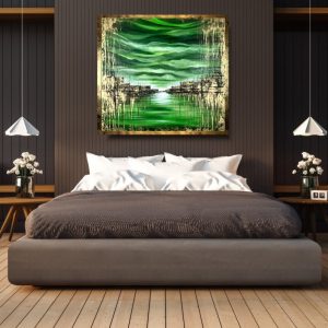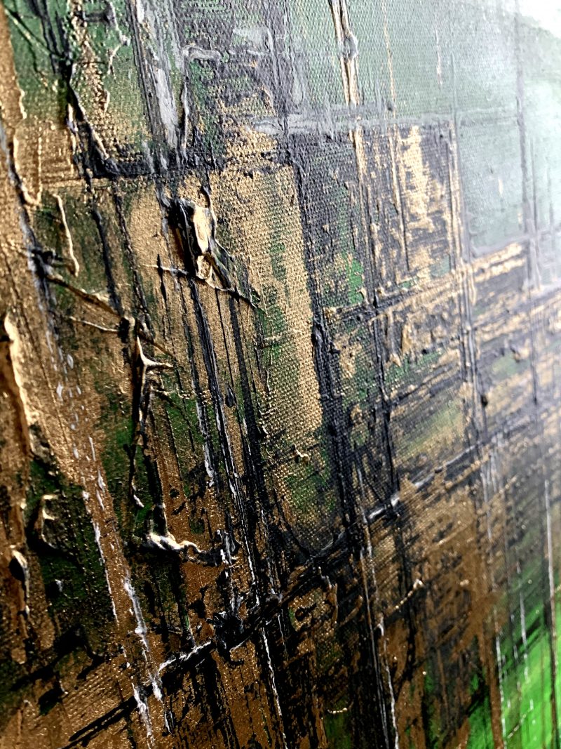 Do namalowania tego obrazu użyto soczystej zielonej palety barw z odrobiną złota. Piękne złote refleksu obrazu skrzą i mienią się w blasku światła. Abstrakcja to nasza specjalność dlatego inne klasyczne formy malarstwa staramy się przestawić w abstrakcyjny sposób. Obraz w dużym formacie, nowoczesne obrazy do salonu, modne obrazy do biura. Eleganckie obrazy do mieszkania mogą ożywić każde wnętrze – dom, firmę a także mieszkanie.