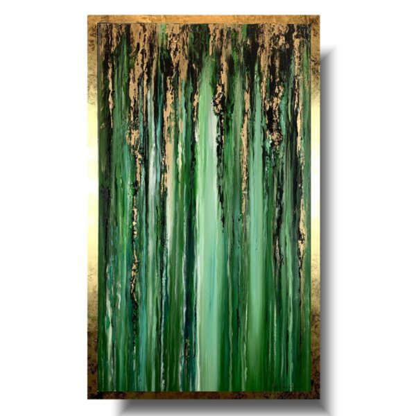 Nowoczesny obraz w ramie „Tropikalna zieleń” abstrakcja to kolejny obraz z serii obrazów „płynących”. Blask zieleni spotęgowany poprzez fakturowe nałożenie farby oraz złociste refleksy poziomo ociekających smug przywodzi na myśl spływającego deszczu po czystej tafli szkła. Nowoczesny obraz w ramie tropikalna zieleń naszego autorstwa w eleganckiej, modnej kolorystyce butelkowej zieleni. Kolory użytej farby akrylowej dodają tajemniczości i powiewu świeżości dlatego nikt nie przejdzie obok niego obojętnie. Obraz idealnie ozdobi nowoczesny salon czy modne biuro. Nowoczesne abstrakcje to nasza specjalność dlatego poświęcamy się im bez reszty. Wykonujemy obrazy marynistyczne, obrazy kwiaty, obrazy aniołów, obrazy dzielone – dyptyk, tryptyk, fortyk, obrazy jednoczęściowe w dużym formacie. Możemy namalować każdy obraz z naszej oferty w zmienionych wymiarach lub kolorystyce, możemy namalować obraz dzielony na jednej części lub obraz jednoczęściowy podzielić na kilka części.