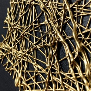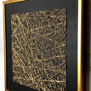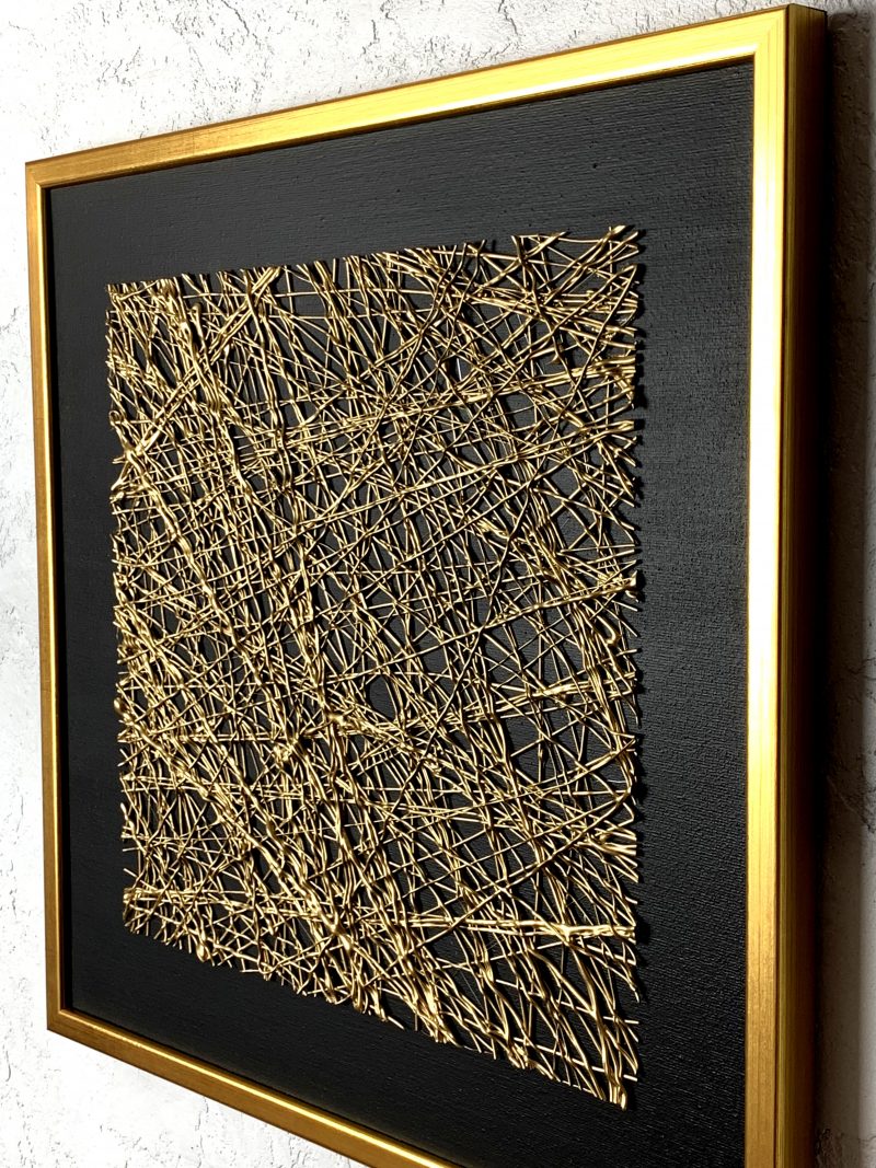 Nowoczesny obraz do salonu złota siatka to elegancki czarny minimalistyczny obraz ze strukturą 3D w kolorze złotym i złotą ramą. Obraz wykonywany ręcznie. Abstrakcja to nasza specjalność.
