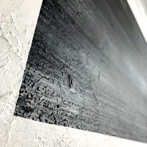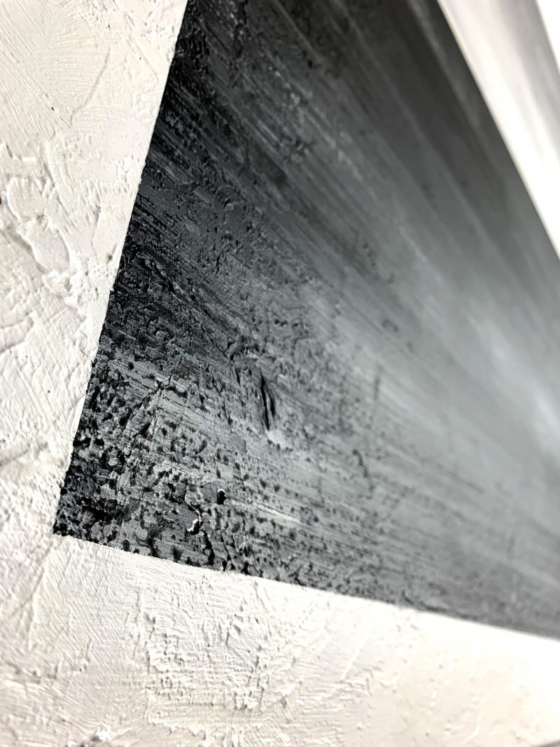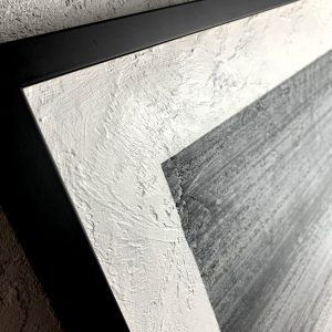Obraz abstrakcyjny “Na horyzoncie” 2207A to minimalistyczny widok w odcieniach szarości z białym passpartout. Na zbliżeniu widoczna jest wyraźna faktura farby. Modny obraz ręcznie malowany sprzedawany jest w prostej czarnej ramie.