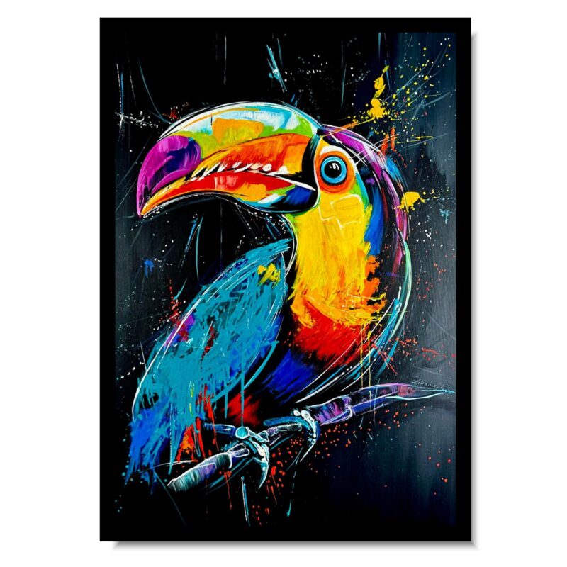Obraz abstrakcja do salonu zwierzęta “Kolorowy tukan” składa się z 1 części