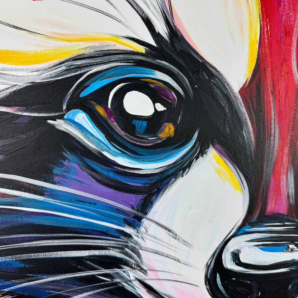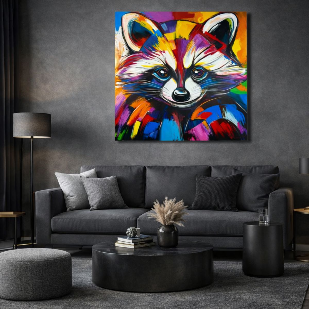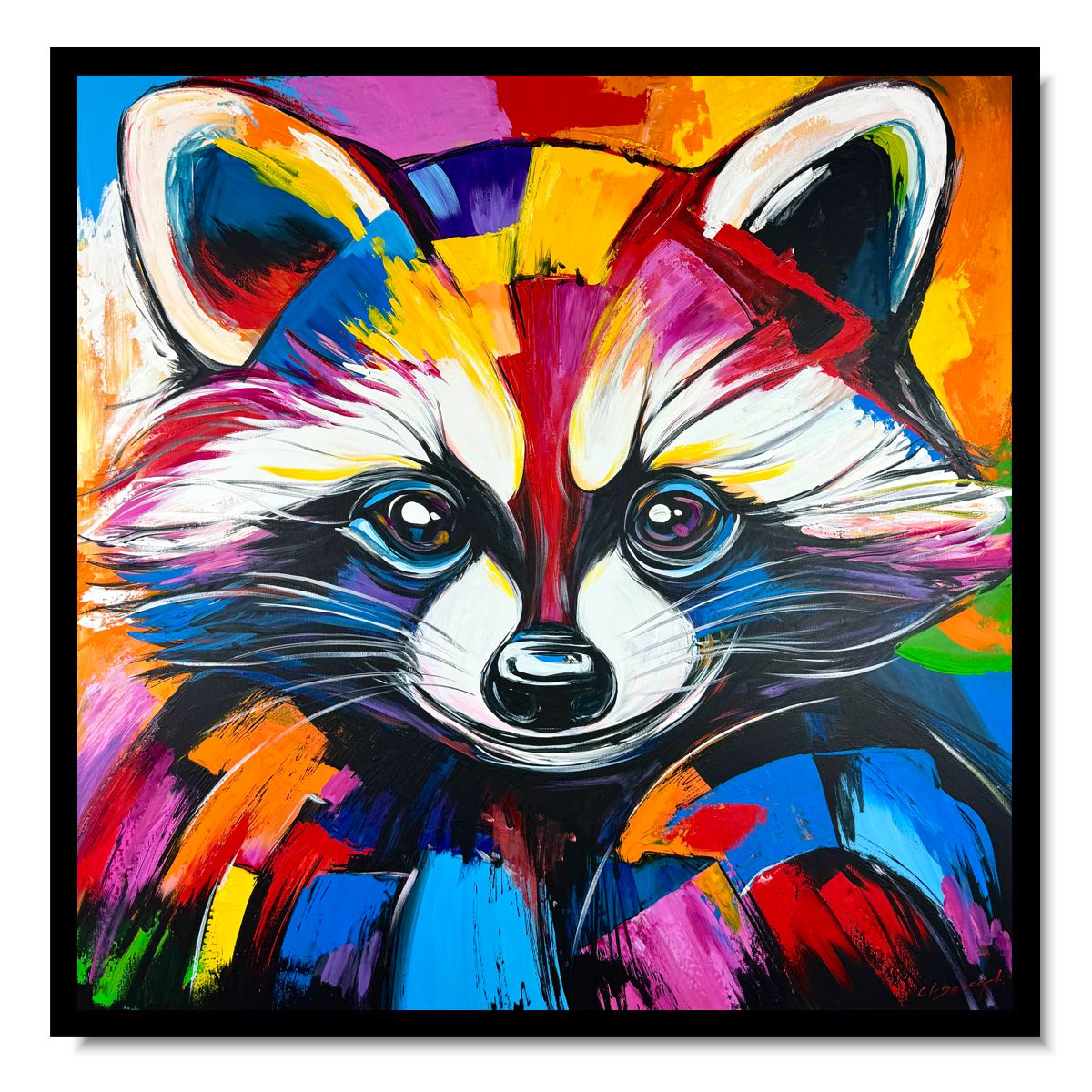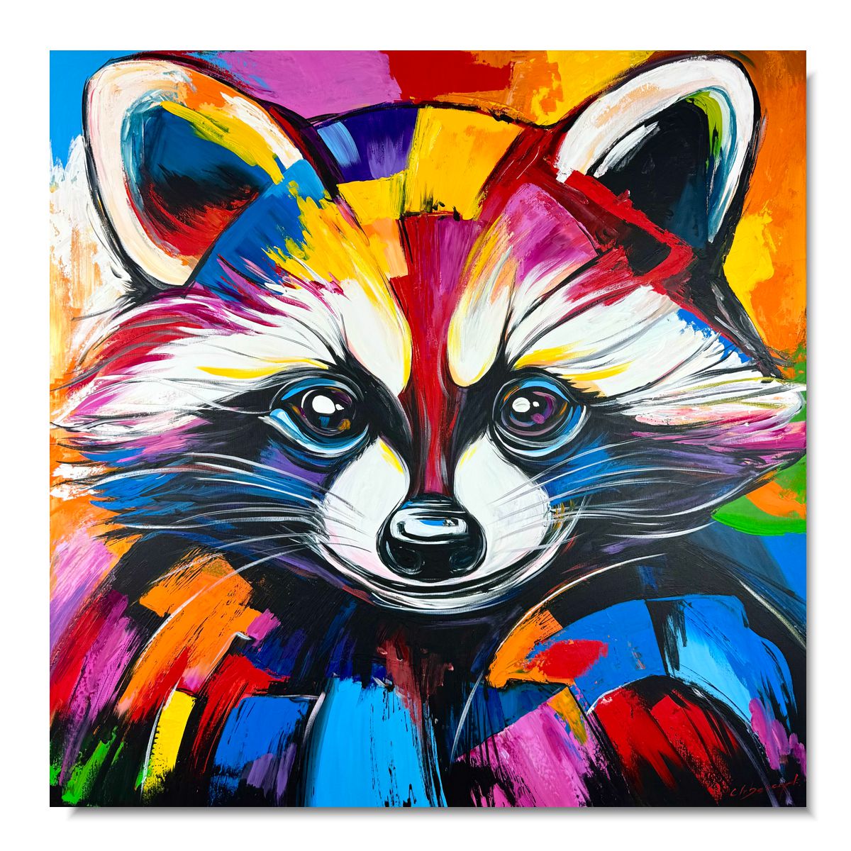 Obraz abstrakcja „Kolorowy szop pracz” 2343A Ten wyjątkowy obraz przedstawiający szopa w intensywnej, ekspresyjnej kolorystyce to doskonałe połączenie nowoczesnej sztuki i designerskiego stylu. Dynamiczne pociągnięcia pędzla oraz odważna paleta barw sprawiają, że dzieło natychmiast staje się centralnym punktem każdego wnętrza.