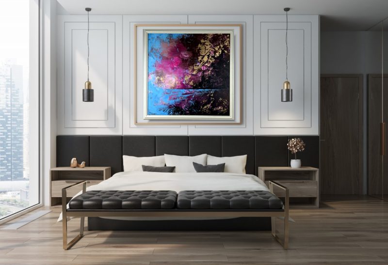 Obraz ręcznie malowany na płótnie “Magiczna chwila”. Wielkoformatowy obraz gdzie dominującą rolę odgrywają koncepcja, konstrukcja i kolor. Plamy barwne powstają tu wprost na płótnie bez wstępnego projektu wizualnego.
