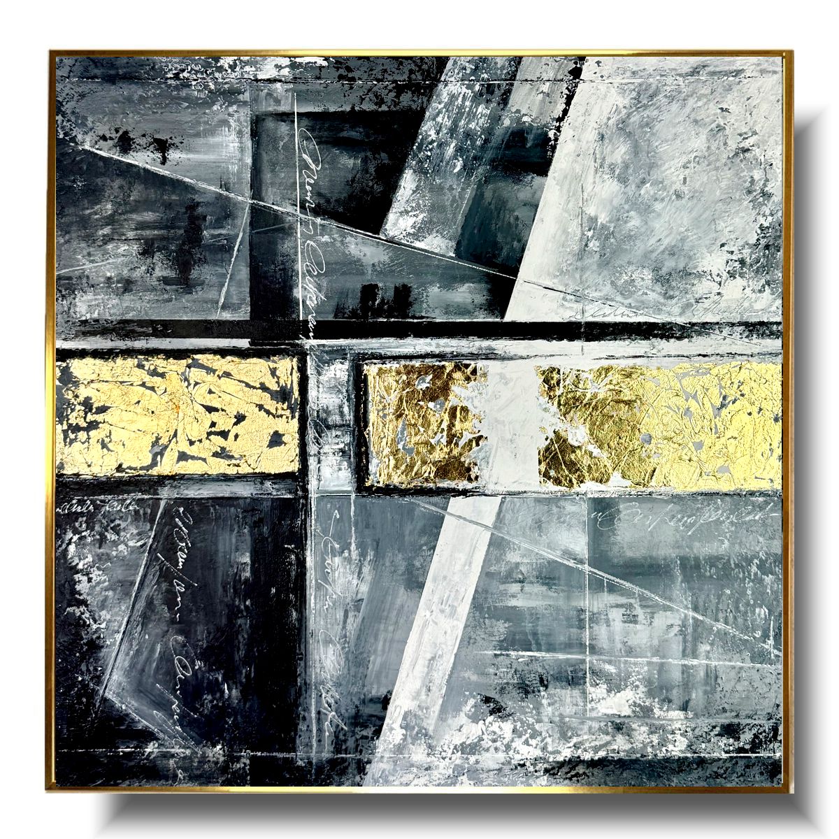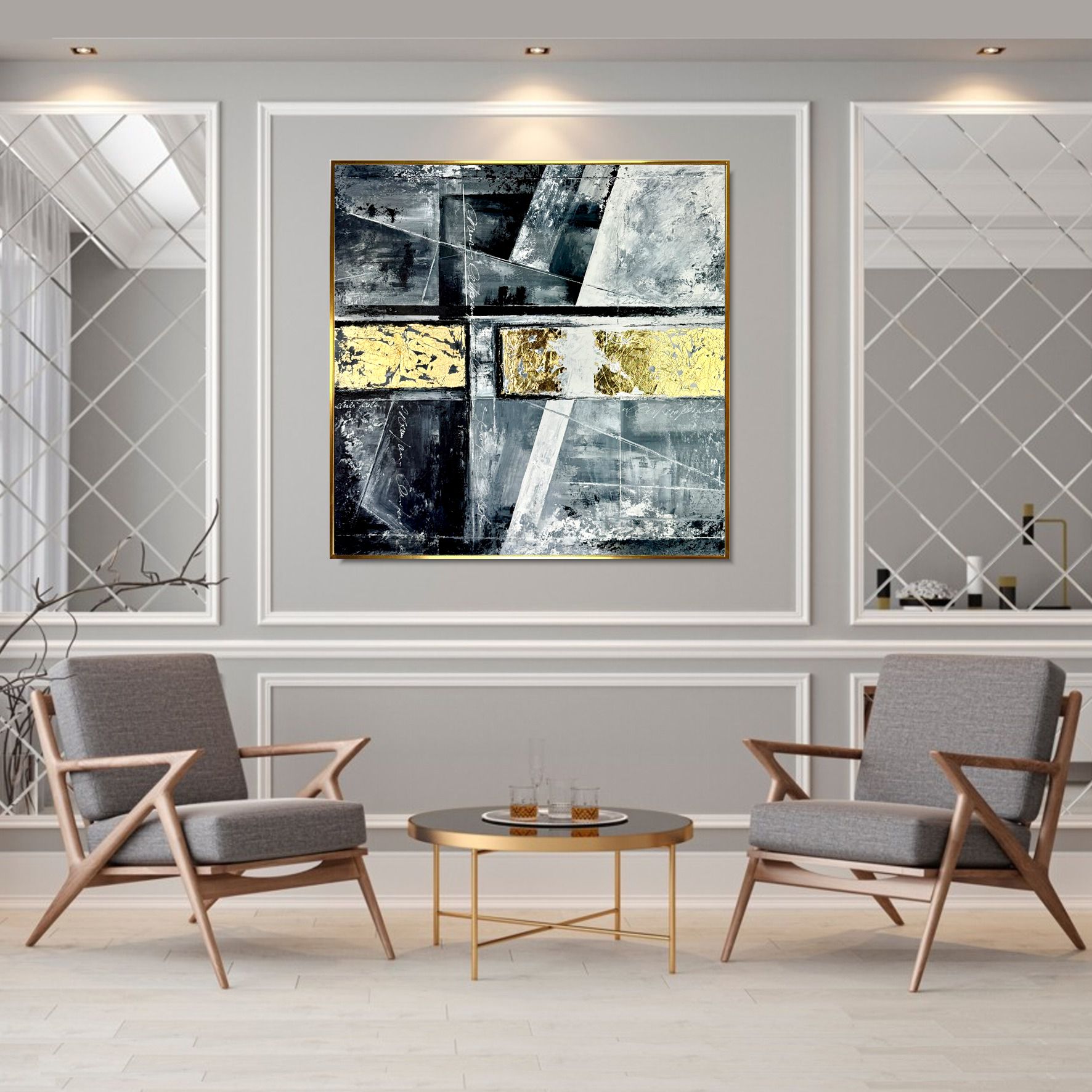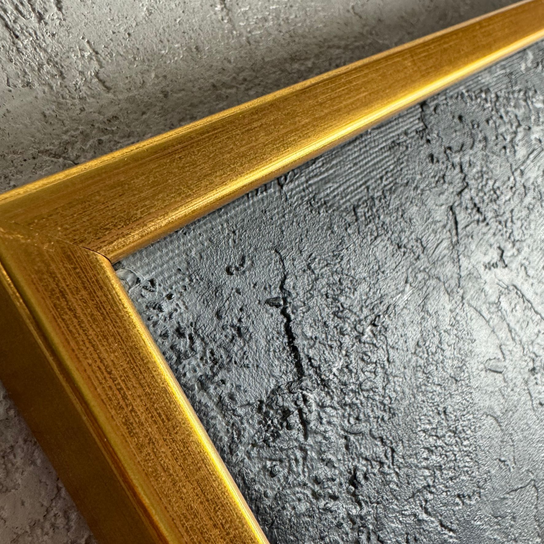 Kolorystyka obrazu: złoty, szary, biały, czarny + złota rama (szerokość listwy 1,5cm)