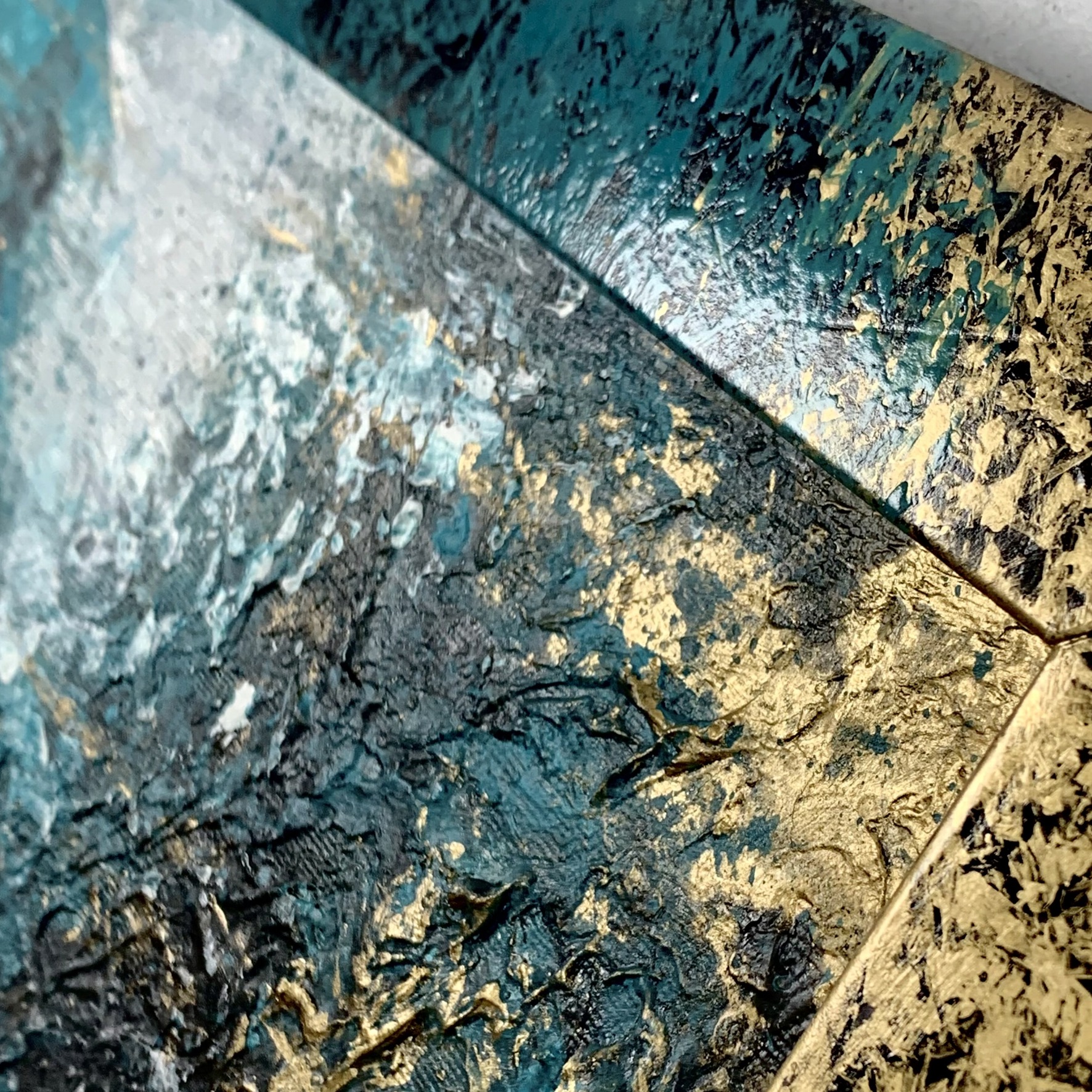 Kolorystyka obrazu: złoty, turkusowy, szary, biały, czarny + złoto-turkusowa przecierana rama (szerokość listwy 4cm)