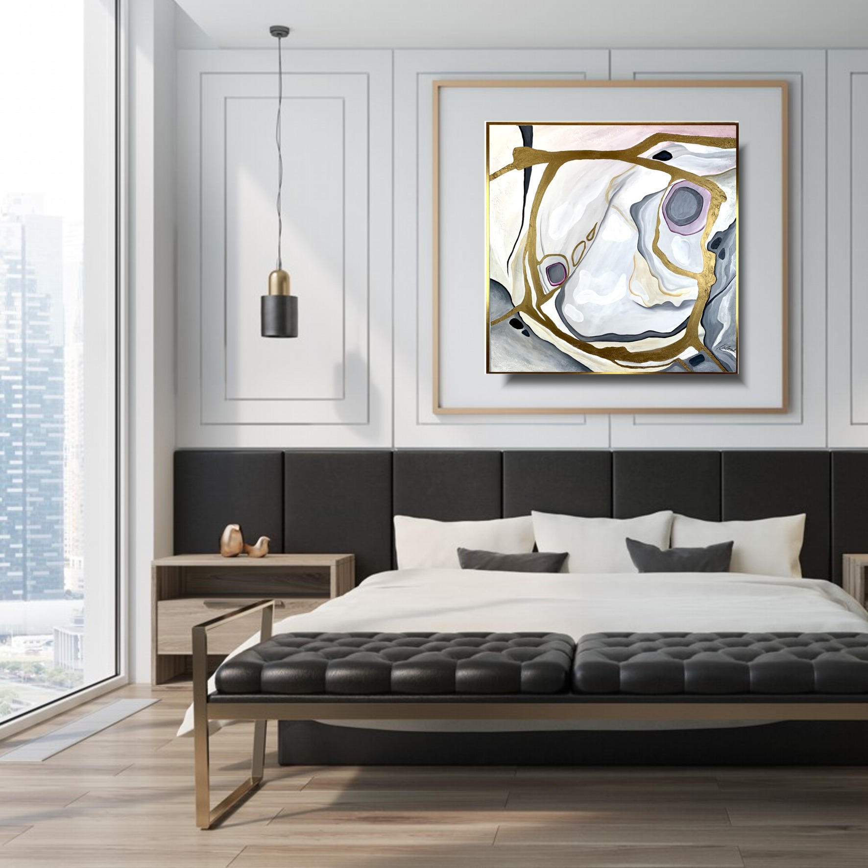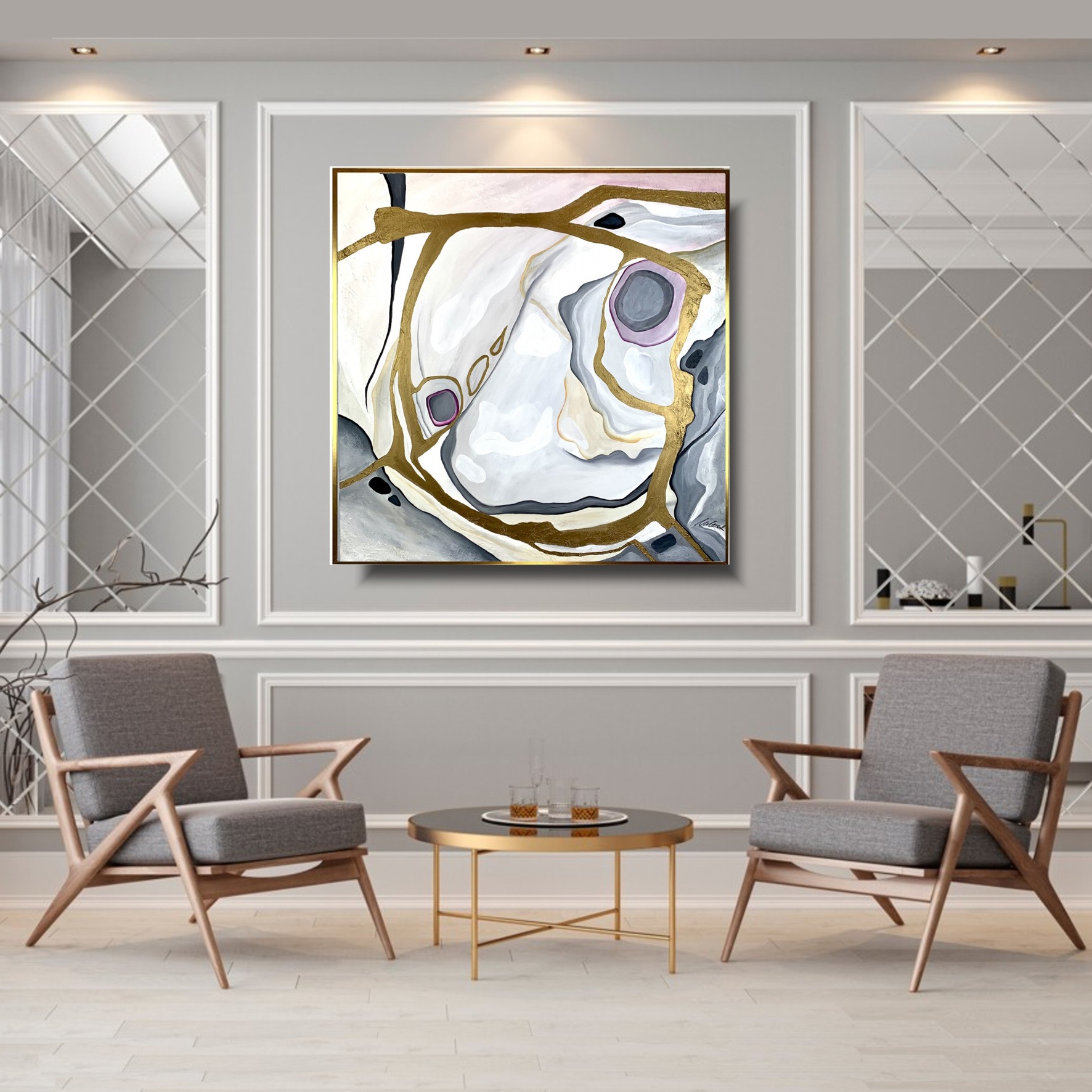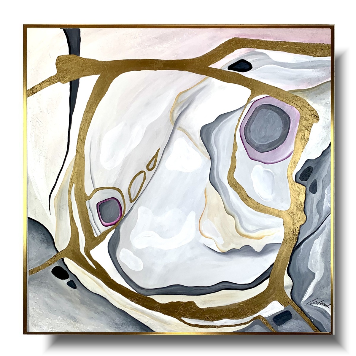 Kolorystyka obrazu: brudny róż, szary, biały, czarny, złoty + złota rama (szerokość listwy 1,5cm)