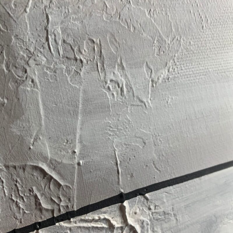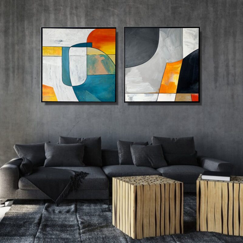 Obraz abstrakcja na płótnie “Mój dom” – komplet dwóch obrazów abstrakcyjnych ręcznie malowanych w nowoczesnych geometrycznych kształtach, w dużym formacie i z czarnym passe-partout to doskonała dekoracja współczesnych, monochromatycznych wnętrz.