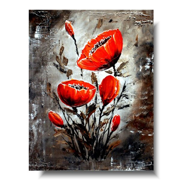 Obraz kwiaty „Bajeczne czerwone maki” w odcieniach czerwieni, szarości i brązu. Idealnie pasuje do wnętrza – salonu, sypialni, przedpokoju czy biura. Oprócz standardowej farby używamy często zaskakującej techniki oraz tworzyw malarskich. Posiadamy wiele modnych wzorów oraz klasycznych motywów – obrazy kwiaty, obrazy drzewa, obrazy pejzaż, obrazy abstrakcje, obrazy anioły. Gdyby jednak zamarzyło się Państwu coś zupełnie odmiennego – malujemy także obrazy na zamówienie, portret na zamówienie.