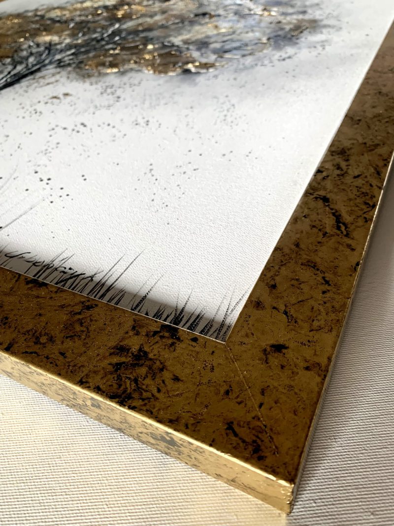 Obraz ręcznie malowany na płótnie “Złote drzewo” 2215A naszego autorstwa w modnej biało złotej kolorystyce i złotej cieniowanej ramie. Kolory użytej farby akrylowej dodają splendoru i powiewu świeżości dlatego nikt nie przejdzie obok niego obojętnie. Obraz malowany złote drzewo to niebanalna dekoracja Twojego salonu.