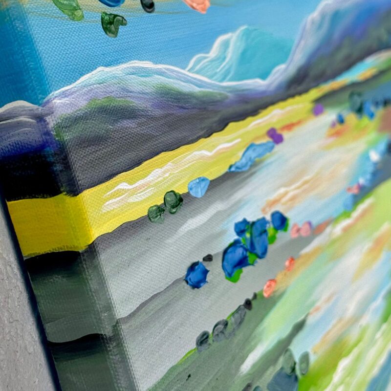 Obraz ręcznie malowany na płótnie “Nad rozlewiskiem” 2276A to piękny pejzaż w trochę abstrakcyjnym stylu przedstawiający rozlewisko na górskim wrzosowisku. Niewielki obraz w pozytywnej kolorystyce, malowany z sercem.