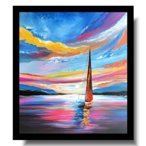 Obraz marynistyczny ręcznie malowany “Wakacyjny rejs” 1923A – odkryj piękno malarskiej wizji zachodu słońca zamkniętej w tej niezwykle efektownej kompozycji. „Wakacyjny rejs” to obraz, który doskonale sprawdzi się w salonie, sypialni, biurze czy przestrzeni wypoczynkowej, tworząc atmosferę harmonii i inspiracji. Ten niezwykle barwny obraz przedstawia samotny żaglowiec sunący po spokojnej tafli wody o zachodzie słońca. Intensywne kolory – od głębokich błękitów, przez świetliste żółcie, nasycone róże i pomarańcze – tworzą spektakularne, niemal surrealistyczne niebo.