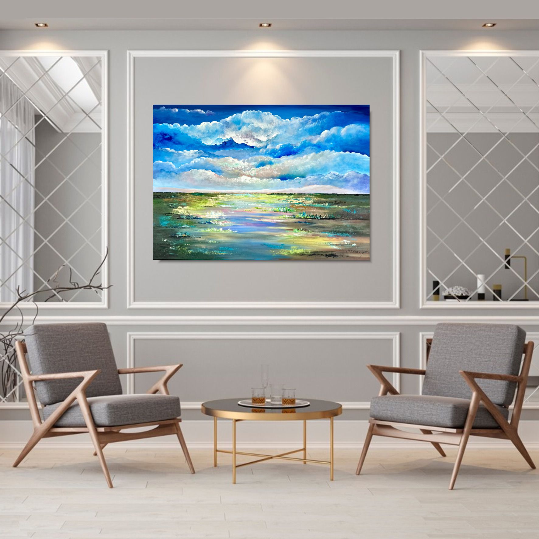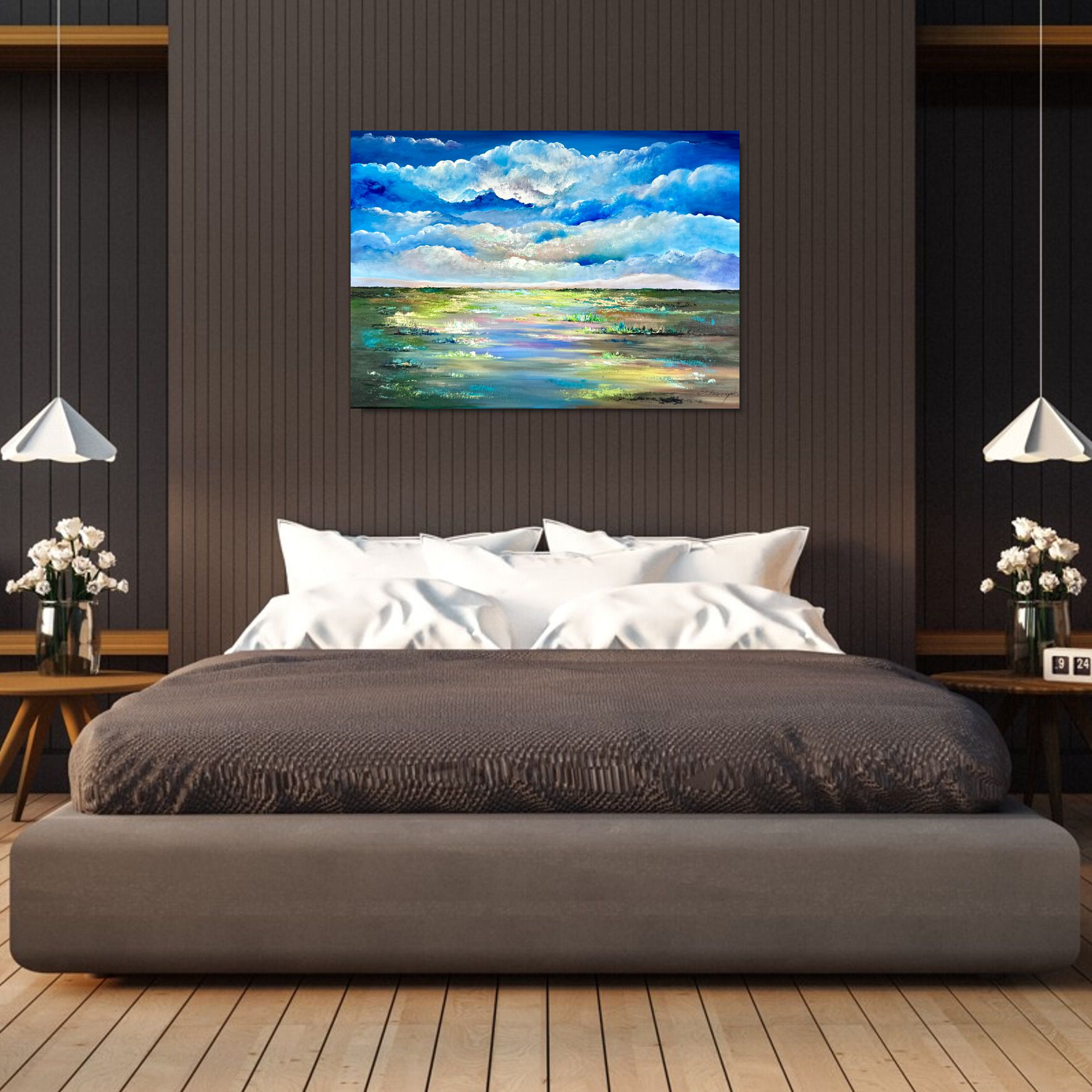 Obraz ręcznie malowany na płótnie „Chmury nad rozlewiskiem” 2146A wyróżnia się pięknym motywem kłębiastych chmur. Motyw nawiązuje do sielskiej spokojnej wycieczki za miasto, Obraz można podarować najbliższej osobie. Cudowny obraz będzie idealnym pomysłem na prezent dla mamy, żony lub szefowej.