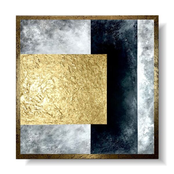 Obraz ręcznie malowany na płótnie ” Cube”. Na płótnie widzimy zderzenie intensywnych odcieni czerni i złota. To obraz to jakby walka między światłem a cieniem, między znanym a nieznanym. To obraz, który stawia pytania i budzi refleksję. Jest to jakby okno do przyszłości, które zarówno przeraża, jak i fascynuje, podkreślając, że abstrakcja jest pełna nieznanego. Abstrakcyjna siła obrazu jest jakby wibracją, która przenika płótno i dociera do odbiorcy, pobudzając zmysły i wywołując emocje. Złoto czarny kwadratowy obraz – Kolor, Forma, Emocja – Odkryj sztukę abstrakcji.