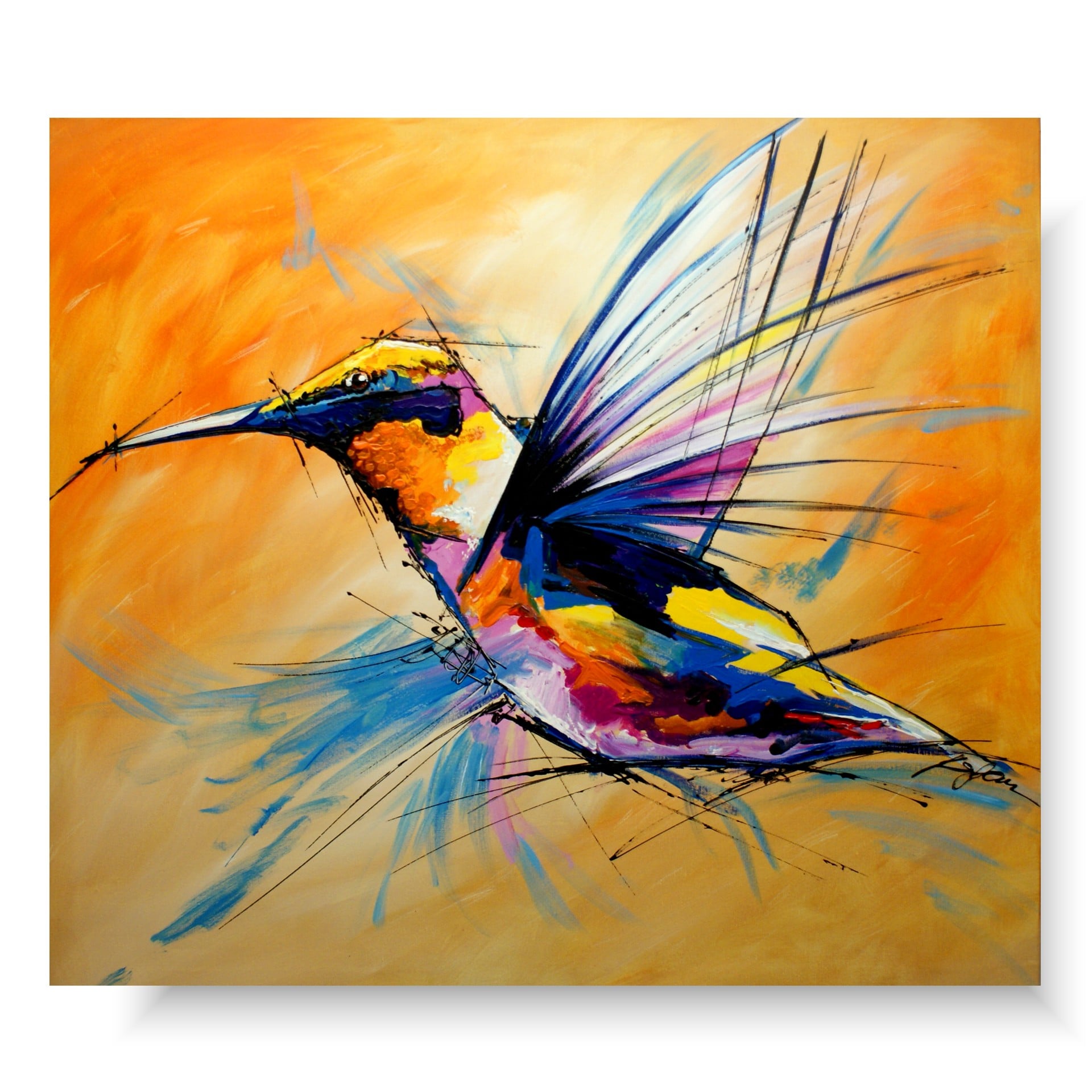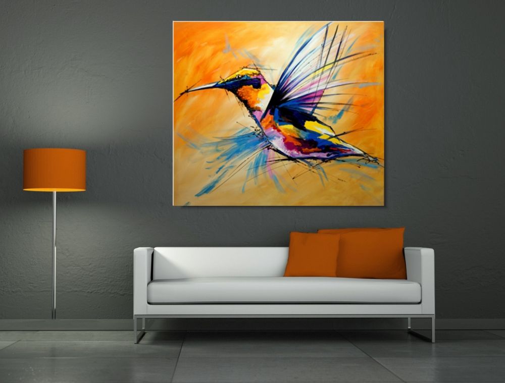Obraz ręcznie malowany na płótnie „Egzotyczny ptak koliber” 1720A to obraz przedstawiający barwnego egzotycznego ptaka. Nasze duże, kolorowe obrazy doskonale prezentują się w monochromatycznych nowoczesnych wnętrzach – malujemy obrazy do gabinetu, obrazy do hotelu, obrazy do biura.