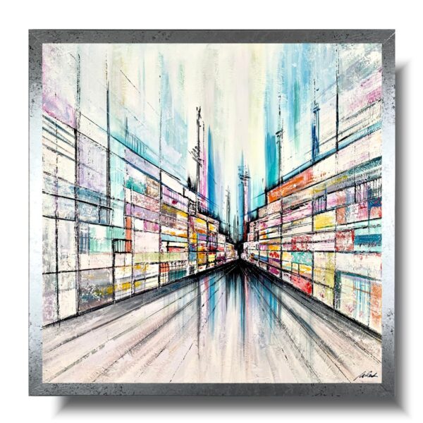 Obraz ręcznie malowany na płótnie „Kolorowa perspektywa” 2187A naszego autorstwa to delikatny kolorowy obraz.  W komplecie jest pasująca stylistycznie rama aby całość stanowiła idealną dekorację salonu, sypialni czy biura.