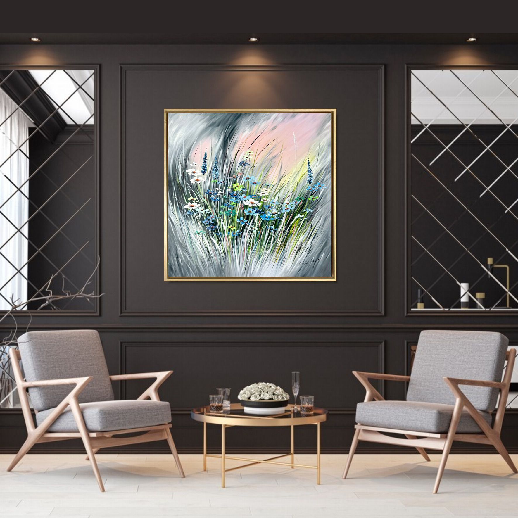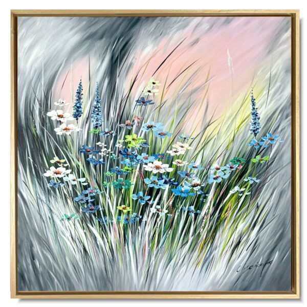 Obraz ręcznie malowany na płótnie „Łąka na zachodzie” 2286A to piękny i delikatny kwiatowy obraz przedstawiający łąkę o zachodzie słońca w zwiewnej, spokojnej kolorystyce.