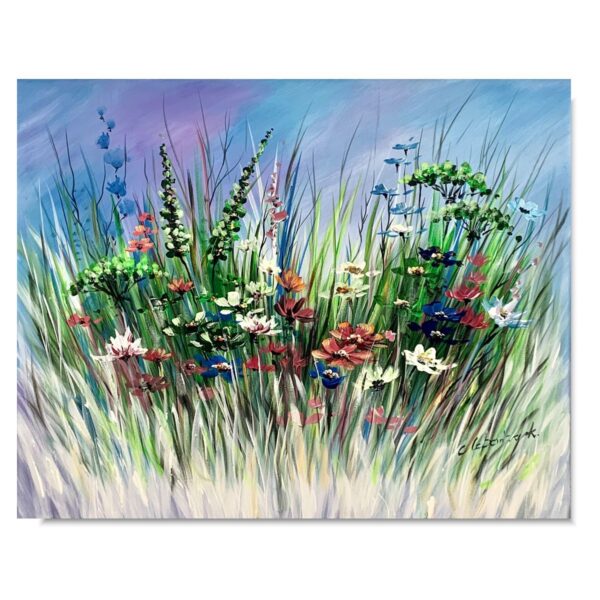 Obraz ręcznie malowany na płótnie „Letnia łąka” 2268A. Ten delikatny obraz przenosi nas w spokojny i chłodny świat pełen ukojenia, gdzie rumianki i wrotycze tworzą malowniczy pejzaż. Cała kompozycja jest nasycona chłodnymi odcieniami, tworząc wrażenie spokoju i harmonii. to obraz, który przywołuje uczucie wyciszenia i zadumy, przenosząc nas do spokojnego zakątka przyrody, gdzie można oderwać się od zgiełku dnia i zanurzyć się w błogim pięknie natury.