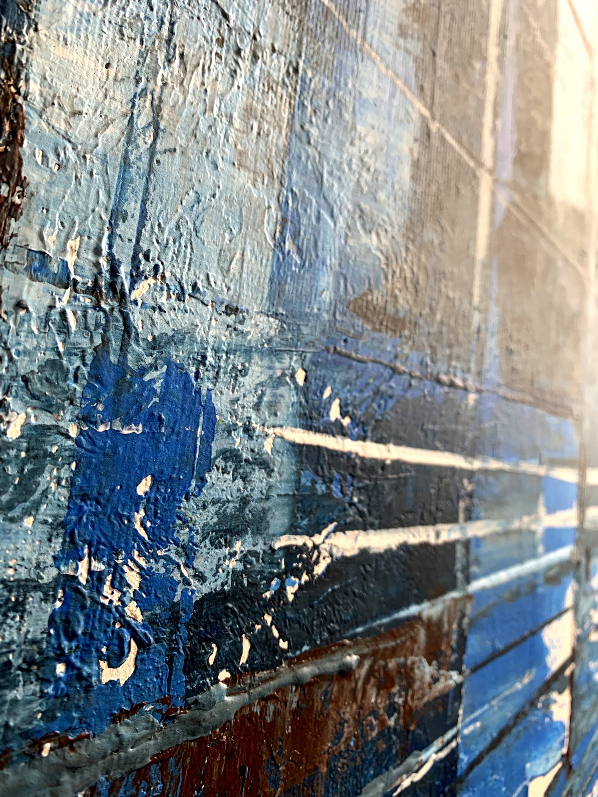 Obraz ręcznie malowany na płótnie „Lodowe miasto” 2211A to obraz, który wizualnie oddaje siłę koloru i faktury. Jest to jakby zapis energii i chwili zamykającej się w warstwach farby. To dzieło sztuki, które mówi zarówno o ruchu, jak i spokoju, jednocześnie zachęcając do refleksji nad pięknem abstrakcyjnej ekspresji. Niebieski obraz miasta przenosi nas w świat ekspresji, gdzie strukturalne warstwy farby tworzą dynamiczną kompozycję. Malowanie szpachelką nadaje dziełu teksturę i trójwymiarowy charakter, tworząc wrażenie ruchu i energii.