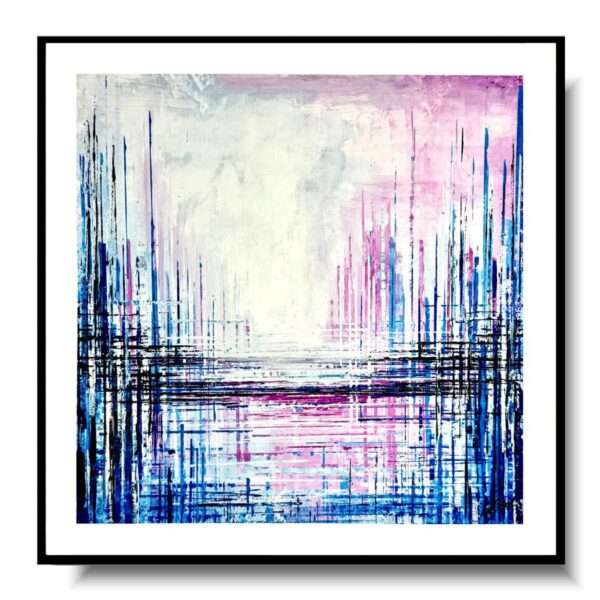 Obraz ręcznie malowany na płótnie „Pozytywna architektura” 2214A to widok na miasto w oddali w kontrastujących kolorach z białym passpartout. Nowoczesny obraz ręcznie malowany w prostej czarnej ramie. Abstrakcja spełniająca najwyższe wymagania.