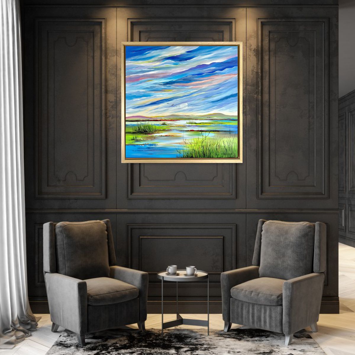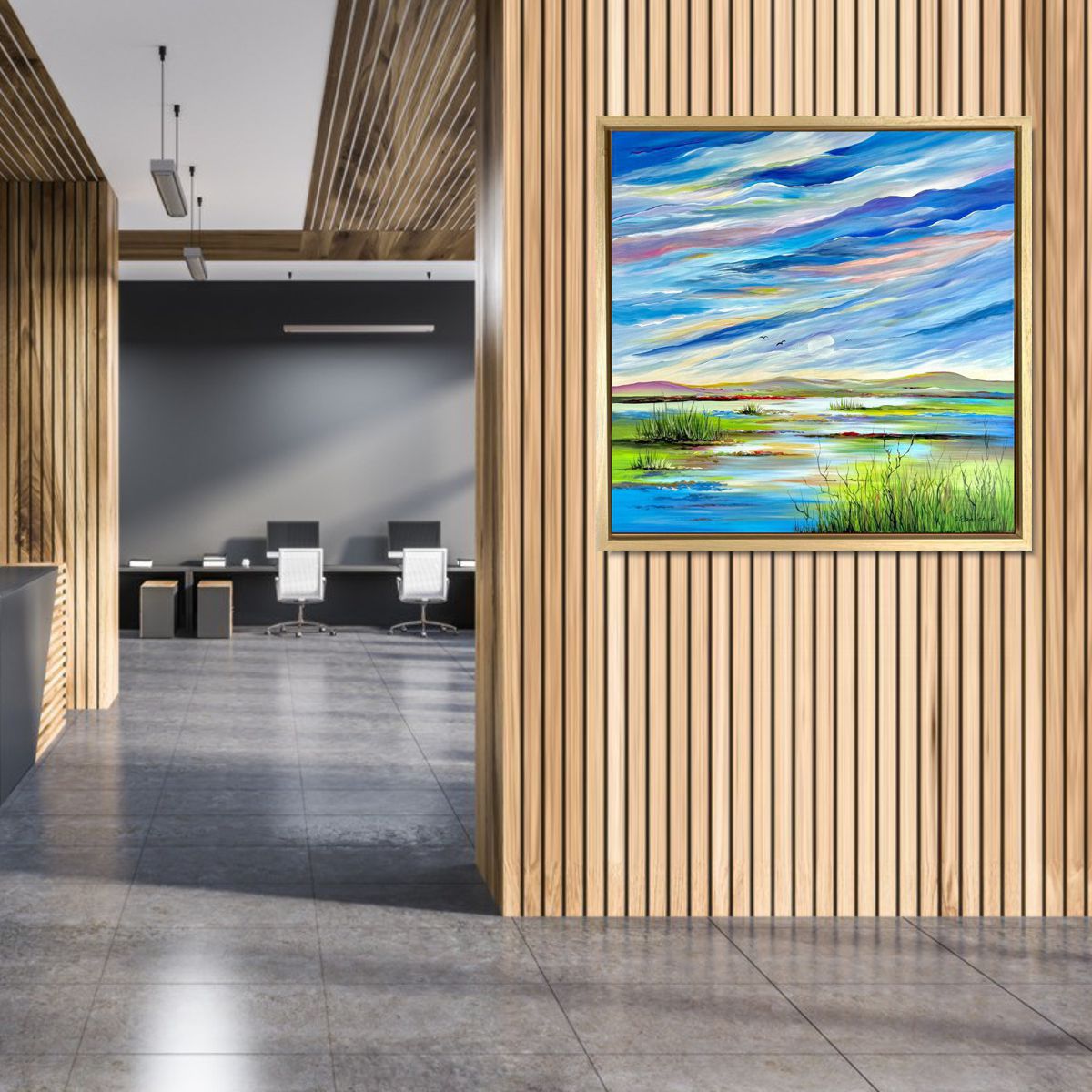 Obraz ręcznie malowany na płótnie „Ptaki w szuwarach” 2147A naszego autorstwa w letniej kolorystyce. Użyte farby akrylowe są w pozytywnych, letnich kolorach a rama z naturalnego drewna. Idealnie ozdobi nowoczesny salon czy modne biuro.
