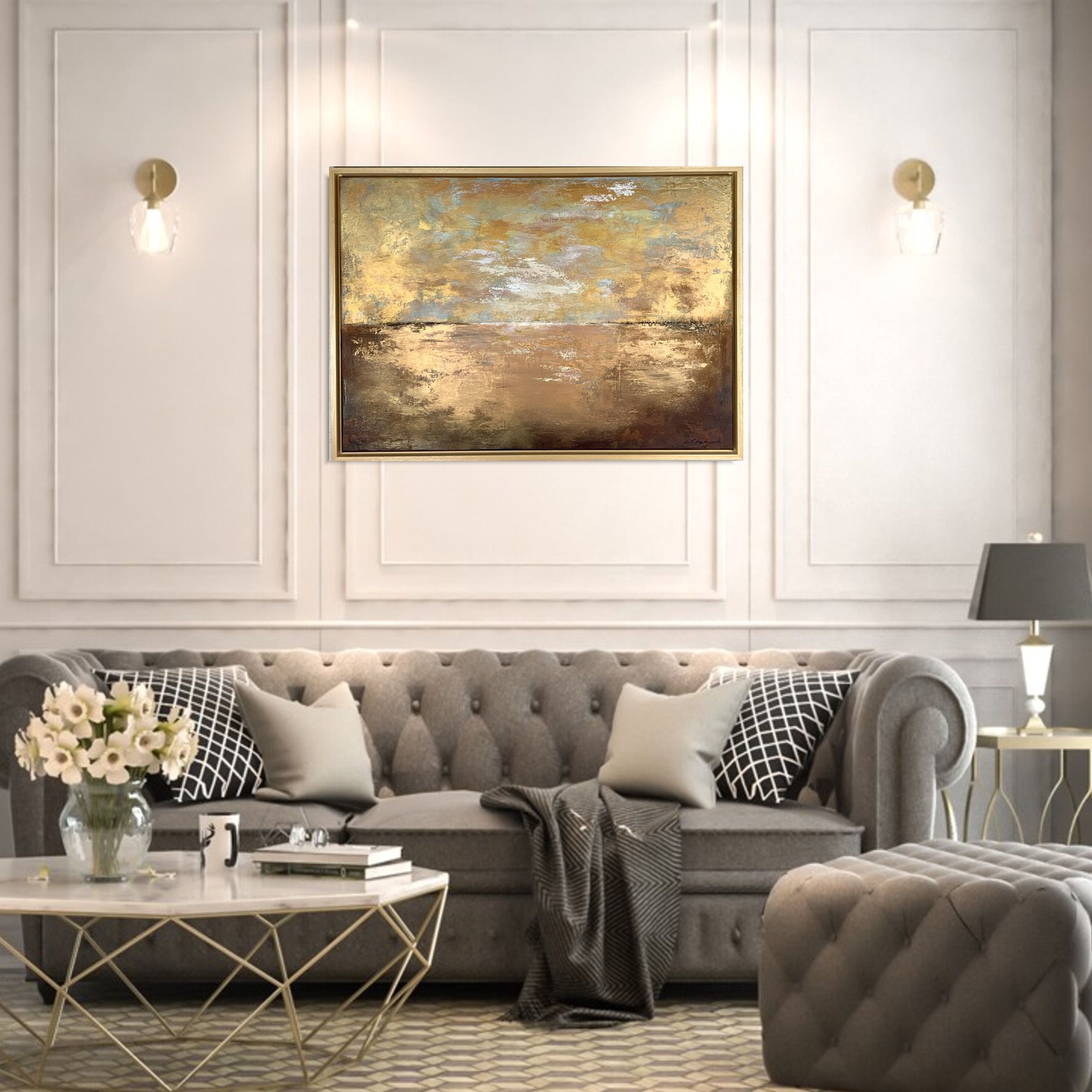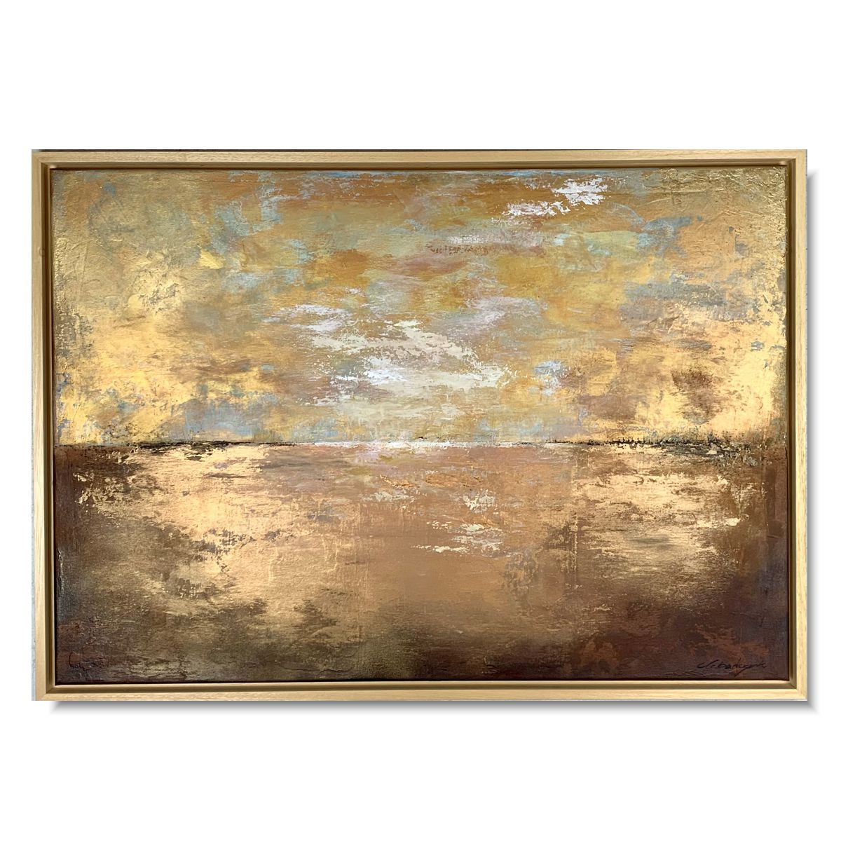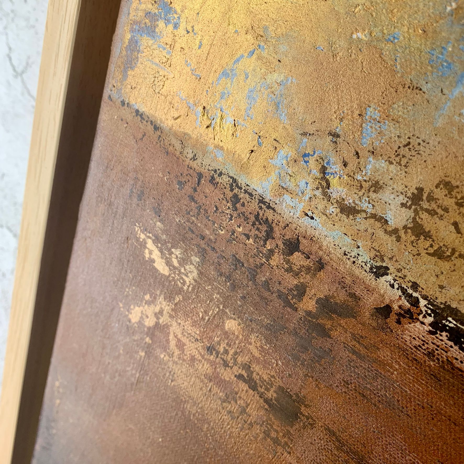 Obraz ręcznie malowany na płótnie „Ziemia obiecana” 2300A to doskonała, bardzo elegancka abstrakcja w kolorach ziemi ze złotymi muśnięciami. Obraz jest oprawiony w ramę pudełkową typu american box w kolorze naturalnego drewna. Obraz wyjęty prosto z natury.