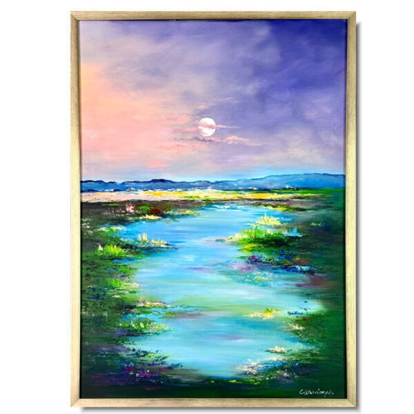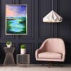 Kolorystyka obrazu: błękitny, niebieski, fioletowy, zielony, pomarańczowy, żółty + złota rama