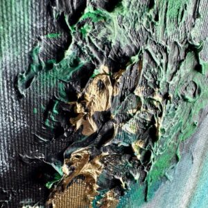 Obraz złoto zielona abstrakcja “Zielony odpływ” 2067A1 to duży pionowy obraz ręcznie malowany w pięknej stonowanej kolorystce z refleksami złota, który cieszy oczy. Abstrakcja to nasza specjalność dlatego inne klasyczne formy malarstwa staramy się przestawić w abstrakcyjny sposób.