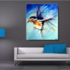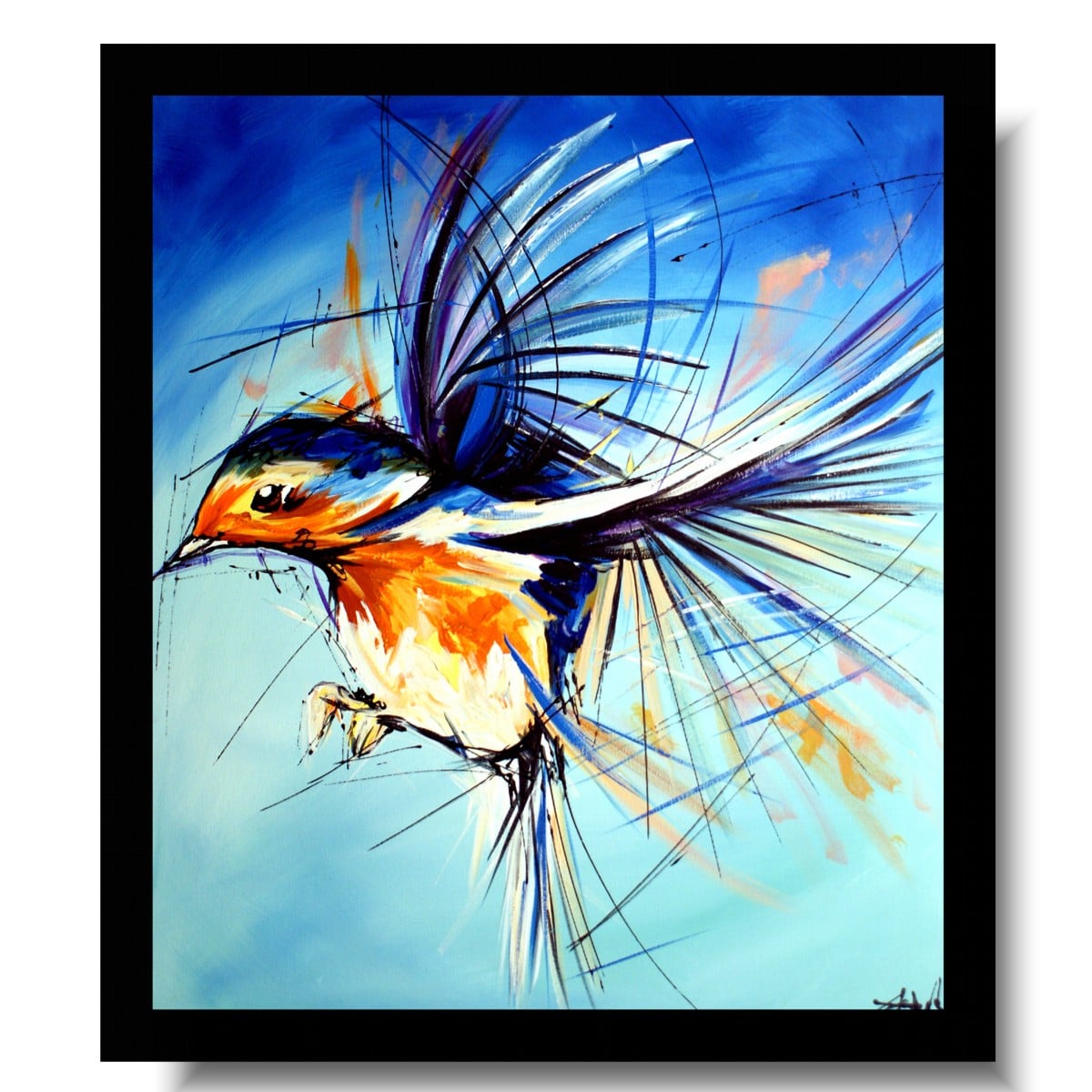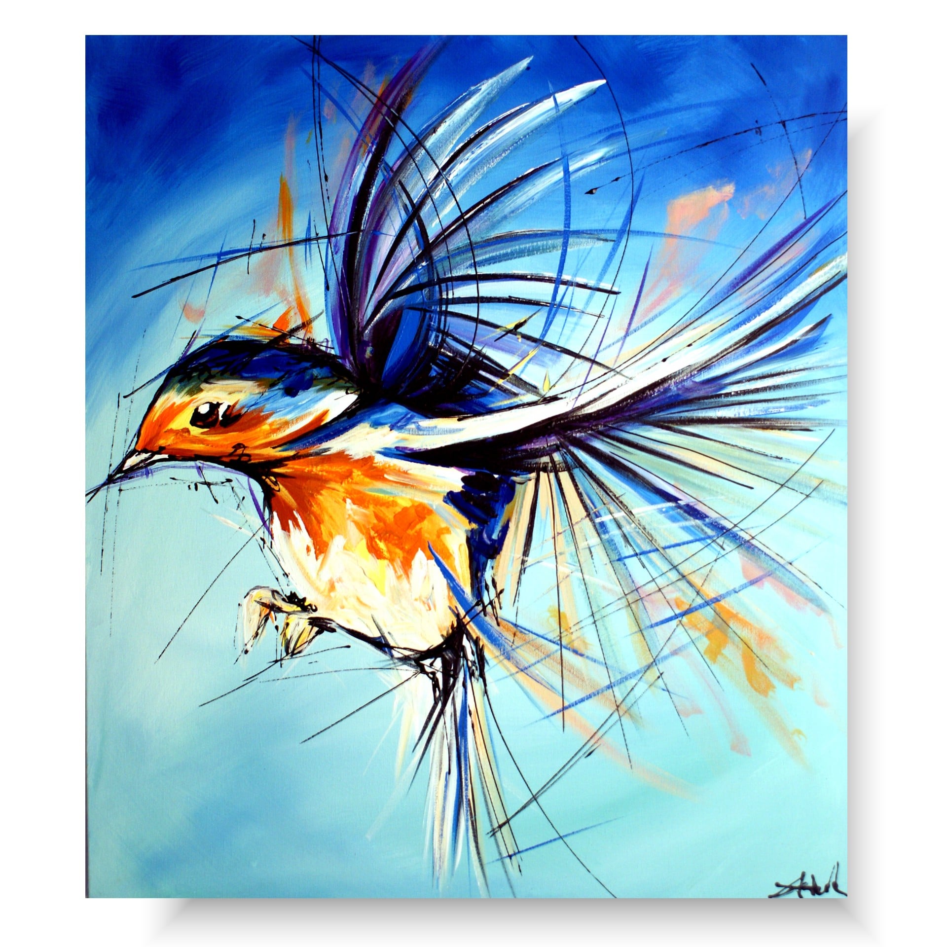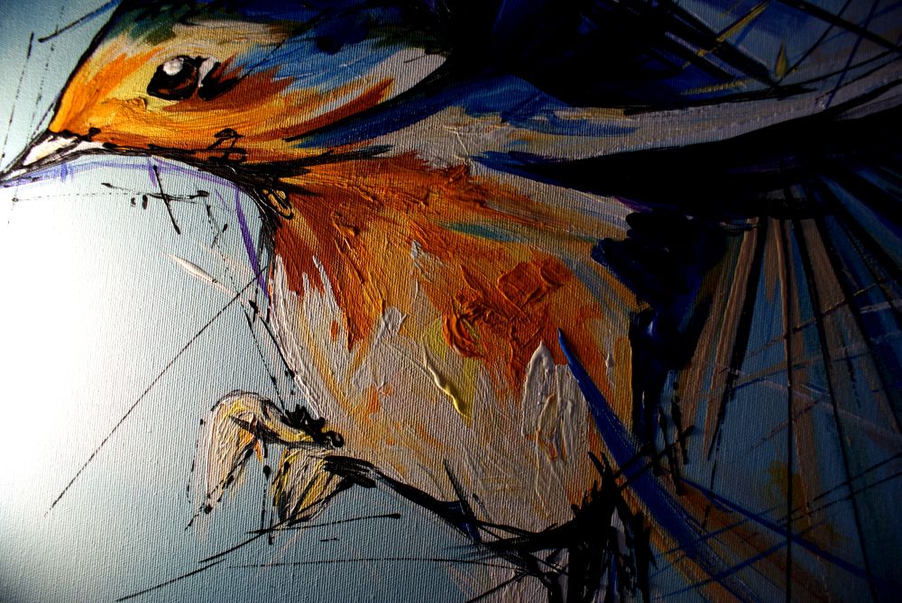 Obraz zwierzęta ptaszek wróbel na wietrze w ciekawej kolorystyce. Modny obraz jest niekonwencjonalny pod względem formalnym jaki i warsztatowym. Do namalowania tego obrazu użyto całej palety barw, co daje efekt nowoczesnego designu. Obraz może ożywić modne jednobarwne wnętrze – salon, biuro, korytarz, restaurację, pub. Możemy namalować  – obrazy z motylami, obrazy z końmi, obrazy z zebrami.