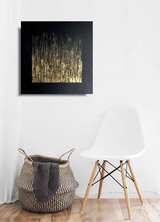 Obrazek do salonu „Złoty płomień” abstrakcja 3D 2190A to mała minimalistyczna abstrakcja w czarnym kolorze ze złotym płomieniem. Abstrakcja ręcznie malowana w minimalistycznej, ale eleganckiej formie. Abstrakcja to nasza specjalność.