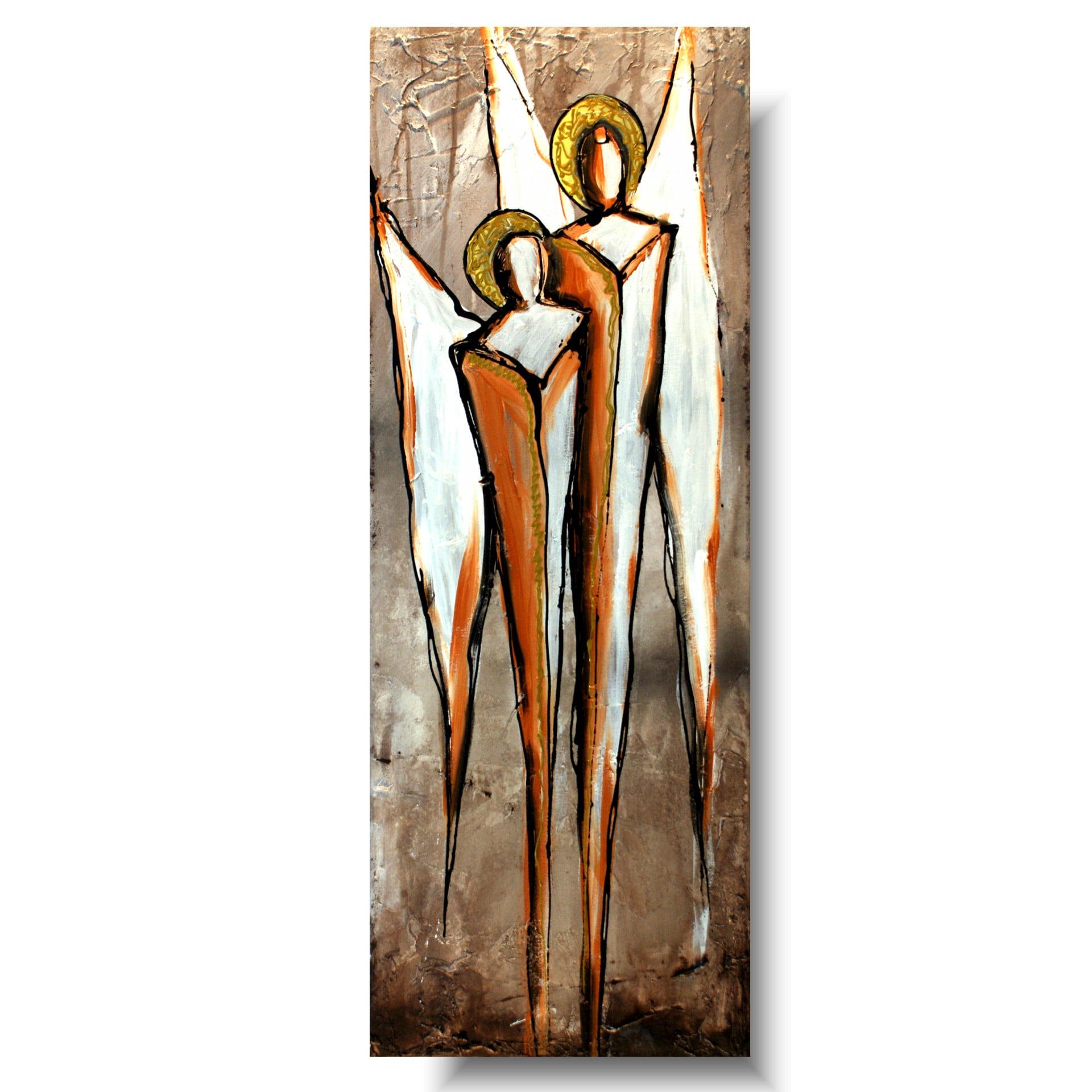 Obrazy rękodzieło anioły szczęścia wykonane z wykorzystaniem zaskakującej techniki to oryginalna propozycja naszego autorstwa. Obraz malowany na płótnie naciągniętym na krosna o grubości 2 cm, wyróżniający się niebanalną strukturą oraz ciekawą kolorystyką w odcieniach beżu, pomarańczu, rudego oraz złotego, a także nutą białego, czarnego i szarego.