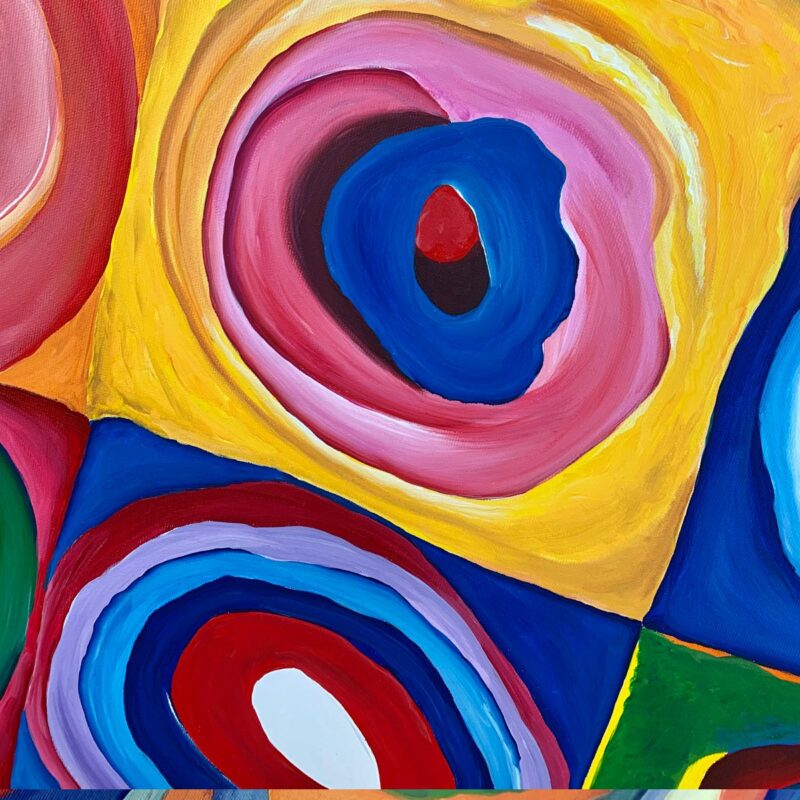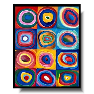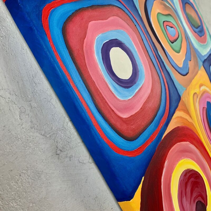Obraz ręcznie malowany na płótnie “Kwadraty z kołami” Kandinsky 2205A w to bardzo kolorowy obraz. Wzorzysta abstrakcja ręcznie malowana w wyjątkowym stylu. Abstrakcja to nasza specjalność.