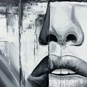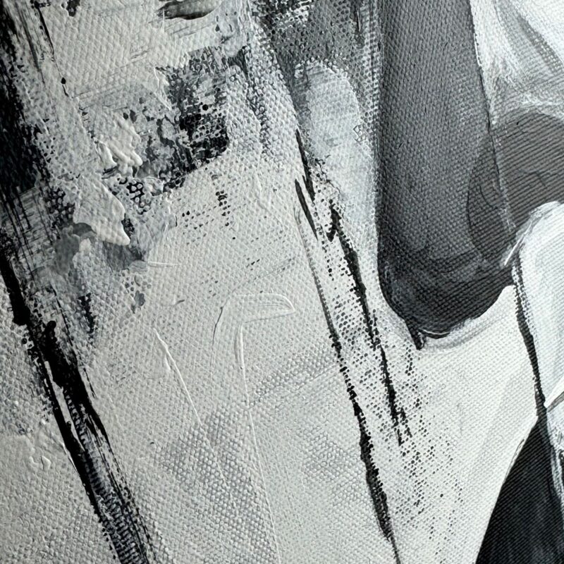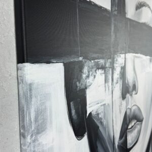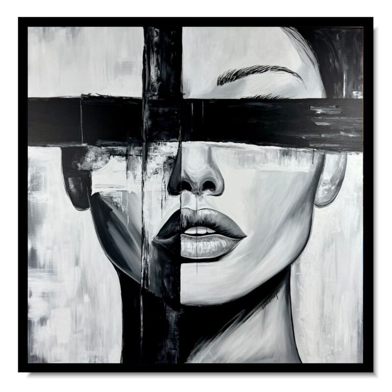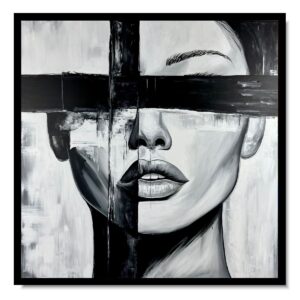 Współczesny portret obraz czarno biały “W niewoli” 2344A przedstawiający twarz silnej kobiety w monochromatycznej kolorystyce. Spokojny, nienachalny obraz do salonu lub sypialni. Duży nowoczesny portret jest doskonałą propozycją na prezent na ślub, urodziny czy rocznicę. Szukasz innego wymiaru – napisz do nas, namalujemy.